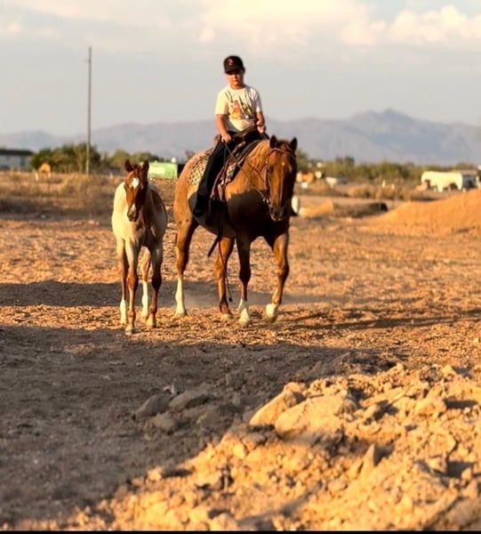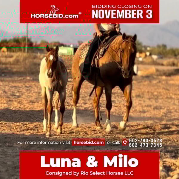 ⚜️𝐓𝐇𝐄 𝐅𝐀𝐋𝐋 𝐇𝐄𝐑𝐈𝐓𝐀𝐆𝐄 𝐂𝐋𝐀𝐒𝐒𝐈𝐂⚜️ Happening now thru MONDAY | NOVEMBER 3rd - Available EXCLUSIVELY on HorseBid's website! For more details and to register visit: www.Horsebid.com CONSIGNOR CONTACT: Rio Select Horses LLC 602-783-3528 602-473-7345 LOCATION: Tonopah Arizona BREED: AQHA REGISTERED: No REGISTERED NAME: Luna & Milo COLOR: Strawberry Roan HEIGHT: 15 AGE: 10 GENDER: Mare Luna and Milo LUNA (bred to WHISPERING GUN) 10 Year Old Grade ( Old owners lost her AQHA papers ) Milo 6 Months Old Grade Colt Should mature to 15h Luna is just a great mare to have around, whether it be for breeding purposes, or even riding as she is broke and sound to ride! Luna isn’t the fanciest mare but will ride out on trails and will ride around the property with our nine year old son and does really well with him, she would be a great addition to someone’s herd/family. She will walk, trot, lope, stop, and backup under saddle but is not by any means going to be your next performance horse. Luna will lunge, tie, bathe, load/hauls, picks up all four, and stands for the farrier. She is an easy keeper and gets along with just about anyone, she is in a smaller herd setting right now and does really well with the others. Lunas has foaled out 3 times and one being a super handsome 4 year old red roan stallion who has an amazing mind on him! She is currently bred to a nice stallion (WHISPERING GUN) for her 4th foal and is 5 months pregnant (confirmed by vet). Milo is still currently on her side but will be weaned soon. Milo is a great minded colt and has the confirmation to make your next rope or barrel prospect! He has good legs on him, and a big round hip, and just about the cutest head and face on him! Milo has been haltered a handful of times and is slowly warming up to people, but is a very curious guy! Milo is currently working on his ground manners like, learning to be a respectful citizen, picking up his feet, tying, and loading and has been doing great! Milo is going to be a great addition to someone’s herd! He is currently in a small herd setting with his mama Luna and does great with the others that are in there, he isn’t disrespectful or rude to others. He is besties with everyone and has just been and easy keeper all around! Don’t miss out on this super cool 3 in 1 package deal! These types don’t come along very often! Give us a call or text us at 📲 602-783-3528 or 📲602-473-7345 to get more information about Luna and Milo (Don’t Hesitate we are here to answer all your questions) 🚚 We also help arrange transportation 🚚