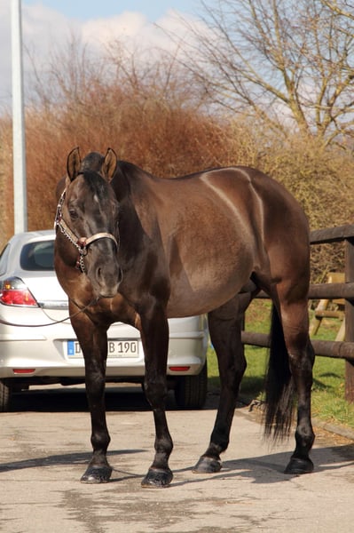 Low-spirited broodmare unsuitable for riding due to arthritis in the right hind knee caused by a pasture accident. 5-panel N/N Heterozygous black Heterozygous dun Very gentle and easy to handle Loading-friendly Currently has a colt foal by DRIFTS CHIP from the 6666 Ranch at foot. Can be sold as a package: mare with foal (€11,000) or separately. Colt foal: Drifts To The Future, born June 5, 2025, black (homozygous black and homozygous agouti). Optionally, the mare can be purchased with a breeding jump from Commander Good Bar for 2026. Further information by phone: +352-621-328144