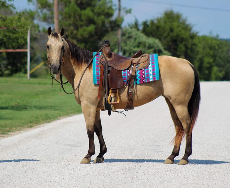 ONLINE AUCTION Place your bids at www.PlatinumEquineAuction.com Starting Bid $3500 Auction ends August 11th, 2024 Need a new saddle? Check out White Rock Saddles on our website or Facebook! They don’t come anymore perfect than this pretty little gal we’re about to Introduce you to ! Butters is a 12 year old buckskin mare standing 14 hds tall . Shes absolutely SAFE for any level rider and will be safe for anyone from 5 to 85 . We trust Butters with everyone ! Butters is the funniest gal to go cruise around on , she’s user friendly and you don’t have to be a cowboy to ride her . She is happy to do whatever you ask of her , she will go out down the trail by herself or in a group . She will cross water , logs , bridges and tarps and whatever else you may come across down the trail with zero hesitation. She is confident all while taking care of her riders . She is the perfect mount for everyone including the littles to enjoy from the trails to arena work . Butters is always a trooper when being rode in town with the heavy traffic , crowds of people and is always the first one to get loved on by everyone . She is the sweetest mare and loves attention always being the first one to greet you in the barn . In the arena she has smooth gaits and transitions . We have gave numerous lessons on her for all levels of riders , she is very forgiving and always try’s 100% to please. She will walk , trot and lope circles , she has a true neck rein on her , moves off of your legs. She is the perfect addition to anyone’s family and not only is she the perfect size she’s Americas favorite color ! She loads and unloads off the trailer great . Stands great to tack up and easy to bridle . Butters is also one you can jump on bareback with a halter and take out for a ride . She clips , ties , stands for the farrier and bathes like a dream. She is truly a unicorn that everyone searches the world for! Call us to schedule a time to come try her out or we can set up a FaceTime call. If you need help with transport don’t hesitate to ask we have a list of reputable haulers that can get her safely to your doorstep world wide. Contact M$ Perf. Horses Michelle 661-817-9120 with any questions. Located in Stephenville, TX. ONLINE AUCTION Place your bids at www.PlatinumEquineAuction.com Starting Bid $3500 Auction ends August 11th, 2024 Need a new saddle? Check out White Rock Saddles on our website or Facebook!
