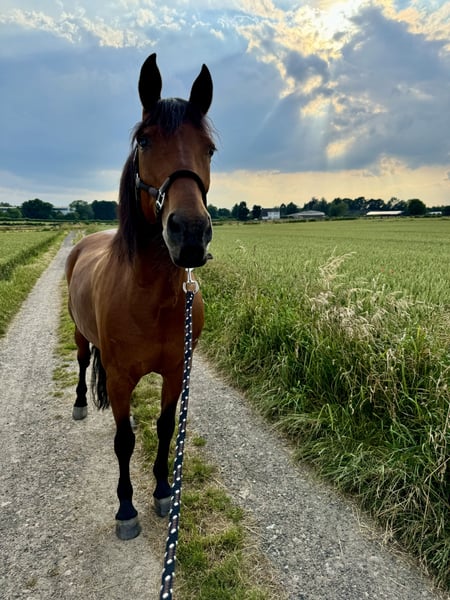 We are selling our Quarter Horse x Andalusian mare, Billy, born in 2011. After a year and a half, we have made the difficult decision to find her a more suitable home, as despite our efforts, the harmony between us has not developed as we had hoped. She is a confident horse with a lot of expression and personality. At the same time, it seems she has had positive experiences in the past – she is particularly sensitive in the stable. She also appears initially cautious around men. However, once she has built trust, she is a very affectionate, attentive horse that genuinely enjoys seeing her handler. Details: - Mare born in May 2011 (13 years old) - Height: 14.1 hh - Color: bay with a small white star - Pedigree: Quarter Horse x Andalusian - Approximately 90% blind in one eye, but this does not affect her performance - Slight saddle resistance Riding: We would say she is not suitable for beginners, as she definitely needs an experienced, calm rider with a gentle hand to ensure both are happy. Her tongue is sensitive/injured, so a soft, fair contact is especially important. She has basic reining training but has mostly been ridden for leisure by us. Due to family reasons, she has recently not been in regular work. Tempo & Terrain: If not properly challenged, she can become quite quick on some days and may even want to race. However, with regular work, she maintains a normal tempo and responds well. In the field, she generally enjoys hacking but is not 100% trail-safe. In certain situations, she may become stressed and restless – therefore, only suitable for riders who can handle such moments confidently. Otherwise, she is quite brave and not easily spooked. Herd Behavior: In the pasture, she is herd-compatible but needs plenty of space. In smaller paddocks, she should ideally be kept alone. She is very dominant but can coexist with geldings in the right setting. --- It is important to us that she finds a loving, experienced home where her sensitivity is understood, and she is given security through calm, clear, and fair handling. We wish for her a new home that may be a better fit – so she can truly find her people and feel at home there.
