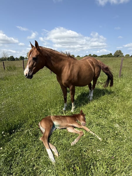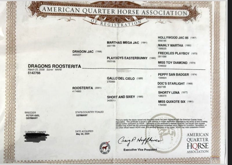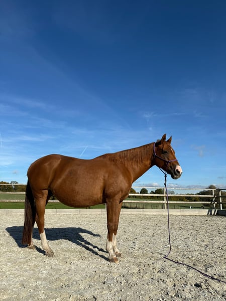 Dragons Roosterita – experienced and gentle Quarter Horse mare 🩶 Born on March 23, 2008 Color: Sorrel Dragons Roosterita is a friendly and well-balanced Quarter Horse mare with fine lineage and extensive experience. She comes from proven reining and working cow horse bloodlines, including Hollywood Jac 86, Freckles Playboy, Peppy San Badger, and Shorty Lena. ⸻ 🐴 Character & Training Roosterita is people-oriented, easy to handle, and reliable. She is accustomed to being ridden by children and always shows herself to be friendly and attentive. In the herd, she ranks low, avoids conflicts, and lives harmoniously within the group. As an experienced broodmare, she has raised several foals. She is caring, attentive, and instinctively secure—an excellent mother with a lot of experience. ⸻ 🏡 Stabling & Handling Roosterita is kept in an open stable with family contact and is well accustomed to daily human interaction. She allows grooming, leading, loading, and is uncomplicated with the farrier. ⸻ 📜 Pedigree & Papers • Registered with AQHA • Lineage includes Hollywood Jac 86, Freckles Playboy, Peppy San Badger, Shorty Lena • Born in Germany • AQHA Registration No.: 5142766 ⸻ 📍 Location: 23923 Schönberg (Mecklenburg) 💰 Mare Price: €12,000 🪶 Optional: A suitable saddle can be included upon request for €3,500. ⸻ Dragons Roosterita is a loving and experienced mare who impresses with her friendly nature and reliability—ideal for breeding, leisure riding, or family use. For inquiries or questions, feel free to contact us at any time – Roosterita looks forward to finding caring new owners. 🤍