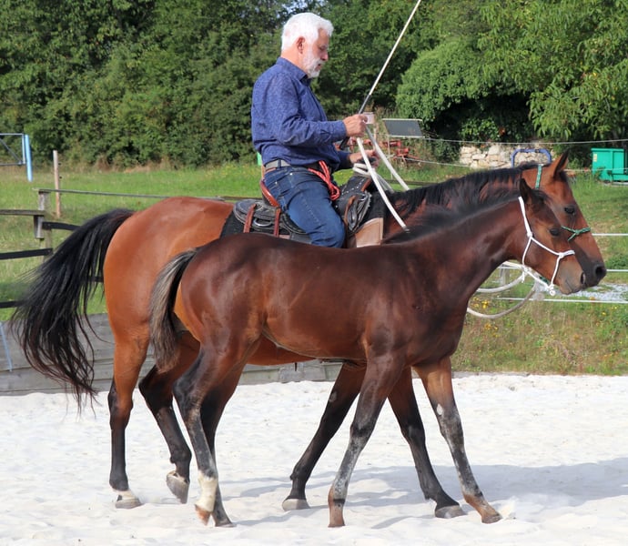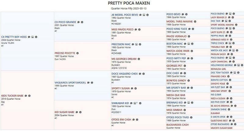 Poca es muy típica, bien conformada y sociable con las personas. Su linaje de ranch horse por parte de padre combina cualidades de Cutting, Reining y Working Cowhorse, mientras que por parte de madre hereda esas habilidades. Actualmente disfruta de la vida en una gran pradera. La estamos preparando con cuidado para su futuro mediante métodos de Natural Horsemanship.