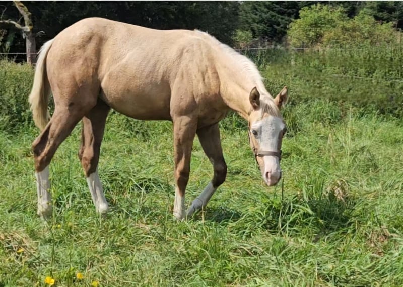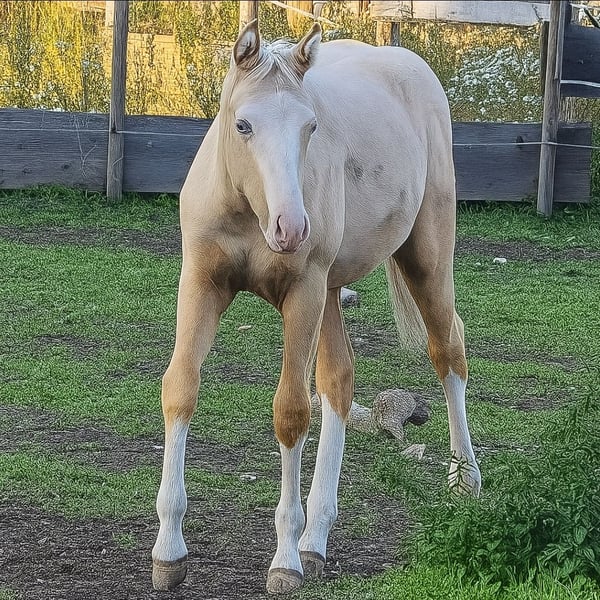 Zum Verkauf steht unser extrem schönes AQH Stutfohlen *3/25 in Traumfarbe palomino splash. Sie ist sehr harmonisch gebaut, mit sehr ansprechender Oberlinie und sehr süßem Köpfchen. Sie hat außerordentlich gute Bewegungen. Endmaß geschätzt 1,52m. Charakterlich ist sie sehr fein, bei"Hauruck" geht sie lieber. Alle Papiere & Pass sind beantragt. Abstammung: Spooks Grand Slam × Luna Flashpep. Abgesetzt, mit Tetanus grundimmunisiert, täglich gehändelt, täglich Kraft- und Mineralfuttergabe, dem Schmied vorgestellt, kann auf Wunsch zur weiteren Aufzucht bleiben. Standort 83128 Kontakt 01721616272