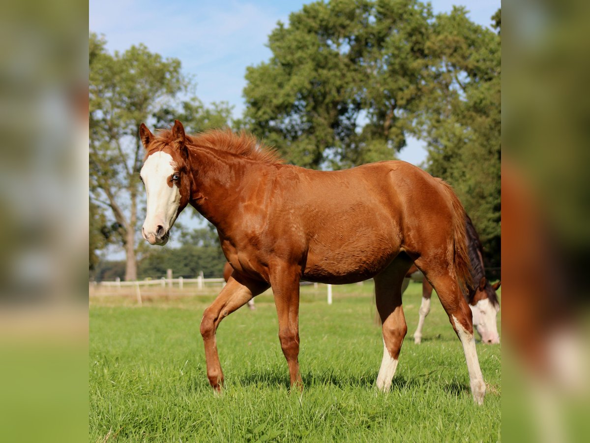 Custom Splash, geboren am 19.03.2025 mit einem Endmaß von ca. 150-153 cm, ist eine außergewöhnliche Sorrel Splash Quarter Horse Stute, die sofort ins Auge fällt. Mit ihrem markanten, ausdrucksstarken Gesicht, dem auffälligen blauen Auge links und dem partiell blauen Auge rechts sowie ihrer Fellzeichnung zieht sie alle Blicke auf sich - ein echtes Pferd, das im Gedächtnis bleibt. Ihr großrahmiger, moderner Körperbau, die perfekte Bemuskelung und die harmonische Balance spiegeln ihre natürliche Athletik und Leistungsbereitschaft wider. Sie zeigt von Natur aus Talent für Reining: elegante Körperkontrolle, eine angenehme Selbsthaltung und bemerkenswerte Balance machen sie zu einem vielversprechenden Prospect für ambitionierte Reiter (Non Pro und Open). Doch nicht nur ihr äußerer Auftritt und ihr Potenzial machen sie besonders - Custom Splash überzeugt auch durch ihren Charakter. Sie ist neugierig, aufgeschlossen und sehr menschenbezogen. Ruhig, entspannt und verschmust geht sie auf Menschen zu und lernt schnell Neues. Halfterführig, vertraut mit dem Fohlen-ABC, an Hufegeben, Putzen, Tierarzt- und Hufschmiedbesuche gewöhnt, zeigt sie von Anfang an ein vorbildliches Verhalten. Aufgewachsen im Herdenverband, kennt sie sowohl Box- als auch Offenstallhaltung und erhält eine ausgewogene Fütterung mit Aufzuchts- und Mineralfutter. 5-Panel und Mhym n/n. Sie ist NRHA Germany SSP eingezahlt. Custom Splash ist nicht nur ein Pferd mit herausragendem Reining-Potenzial, sondern auch ein echter Eyecatcher mit erstklassiger Abstammung (Custom Crome x Gunners Last Oak). Sie ist die Stute, die im heutigen Reining-Sport gefragt ist, und bietet sowohl ambitionierten Reitern als auch Züchtern die perfekte Kombination aus Leistung, Ausstrahlung und großrahmigem Typ. Die Abgabe erfolgt direkt vom Züchter - hier wartet ein einmaliges Pferd, das sowohl im Sport, in der Zucht oder als Freizeitpartner begeistern wird.