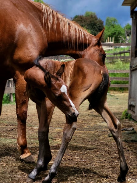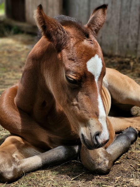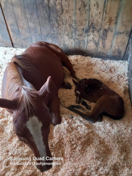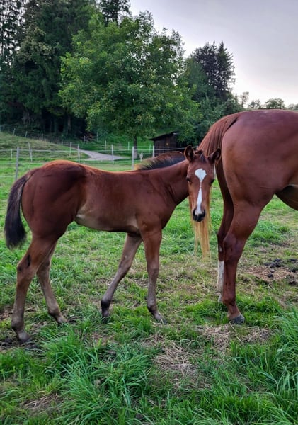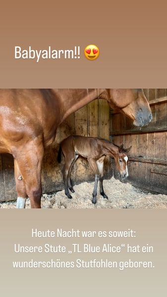 For our "ABBYGALE" (MY BLUE HOT STUFF), we are also looking for a 5-star home. This stunning Quarter Horse mare (born 2025) was born on our farm. Her parents are also located here: Mother: TL Blue Alice (Aint It The Blues) Father: Zippos King Bar Abby is an absolute eye-catcher: Her chestnut coat creates a beautiful contrast to her white blaze and black mane. She has an excellent conformation, and her eyes reflect her curious yet gentle nature. She moves above average and will be suitable for both competitions and leisure riding. So, if you are looking for a little beauty with great potential, Abby is a perfect choice. Abby holds an equine passport from the DQHA, is enrolled in the DQHA Futurity, and has the American registration papers (certificate of registration) from the AQHA. She is currently still with her mother in an open stable/pasture as a foal. She can either stay here for further upbringing or move to her new home once she is no longer nursing. If you would like to meet Abby or have any further questions, please feel free to contact us.