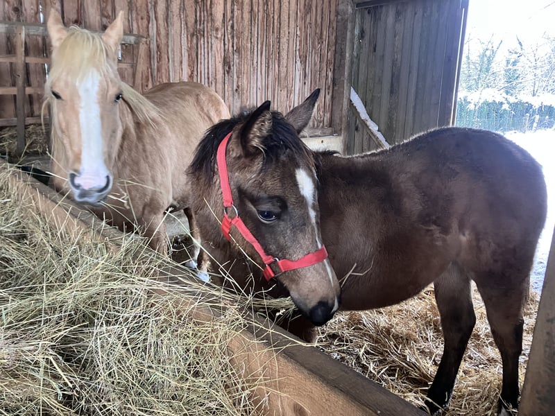 LILLY RUF DUN IT Quarter Horse-Stute, Buckskin, geboren am 08.06.2025 Negativer 6-Panel-Genetest Sehr schöne Konstitution, menschenähnlich gebaut. Herkunft aus Reining- und Ranch- Linien Abstammung: SHINING BLISS CT (LIL RUF PEPPY) und BOOGIES DUN IT NAHR (BOOGIES FLASHY JAC) Führt im Halfter, gibt die Hufe, verladen im Pferdewagen. Standort: Moselle, Frankreich (nahe der deutschen Grenze)