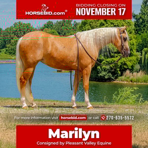 🎲𝓽𝓱𝓮 𝐑𝐈𝐃𝐄𝐑'𝐒 𝓒𝓱𝓸𝓲𝓬𝓮🎲 Happening now thru MONDAY | NOVEMBER 17th - Available EXCLUSIVELY on HorseBid's website! For more details and to register visit: www.Horsebid.com CONSIGNOR CONTACT: Pleasant Valley Equine 270-635-5572 LOCATION: Robards ky BREED: Quarter Horse REGISTERED: Yes REGISTERED NAME: A Smart Gold Chic COLOR: Palomino HEIGHT: 14.2 AGE: 2 GENDER: Mare Meet A Smart Gold Chic also known as Marilyn. She has all the looks, brains and athletic ability to go in any direction you want. She has the best demeanor & has an old soul for a 2 year old. Marilyn is extremely trainable & wants to please. She would make an excellent show horse or she can be a beautiful partner to hit the trails with. We have trail rode her & checked cattle on her. She also been through our desensitizing program. As a yearling she was shown in the in hand classes at ARHA shows & was recently shown & collected several points at the ARHA MId West Cassic. Marilyn has great foundation to her training. She lopes arund with ease, catches both leads. Has a great start to turnarounds & she wants to be a big stopper. Marilyn is soft in the face & gives to the bit laterally & vertically. You wont find many 2 year old that ride this handy & quiet. She stands 14.2 hands and as cute as they come. With her golden palomino color long beautiful mane. Not only is she pretty to look at but she bred well too; out of an own son of Pale Face Dunit. Nu Chex To Cash & Smart Little Lena on her papers too. Marilyn is great for saddling, bathing, clipping, standing for the farrier, & loads & hauls great. She has no meaness about her & would make a great amature, non pro horse to finish out. She sells sound, with no vices or blemishes. Call today to set up appointment to try Marilyn. 270. 635.5572