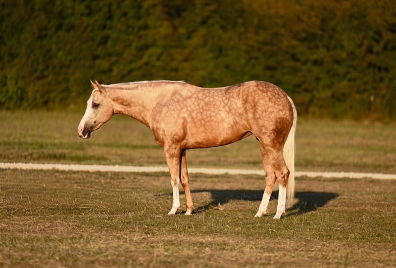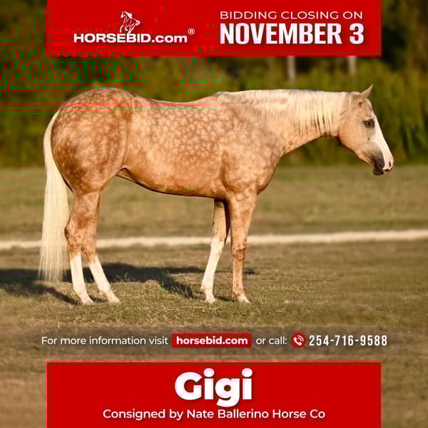 ⚜️𝐓𝐇𝐄 𝐅𝐀𝐋𝐋 𝐇𝐄𝐑𝐈𝐓𝐀𝐆𝐄 𝐂𝐋𝐀𝐒𝐒𝐈𝐂⚜️ Happening now thru MONDAY | NOVEMBER 3rd - Available EXCLUSIVELY on HorseBid's website! For more details and to register visit: www.Horsebid.com CONSIGNOR CONTACT: Nate Ballerino Horse Co 254-716-9588 LOCATION: Waco TX BREED: Quarter Horse REGISTERED: Yes REGISTERED NAME: Grabba Gear COLOR: Palomino HEIGHT: 14.3 AGE: 2 GENDER: Mare This gorgeous 2-year-old palomino “Gigi” is the real deal — the perfect mix of proven genetics, talent, and early training**. She’s sired by Shiftin Gears (LTE: $32,000) and out of a Nu Chex To Cash mare (LTE: $61,000) giving her a pedigree packed with performance, athleticism, and trainability. With 6 months of professional reining training, this filly already knows all the parts — she **turns around correct, stops deep, changes leads, and departs soft**. She’s naturally balanced, willing, and incredibly smooth to ride, showing all the signs of a big-time prospect for the show pen or ranch versatility arena. Beautiful, talented, and smart — she’s everything you want in a young horse with the foundation and mind to go far in any direction. ✅ 2-year-old palomino with exceptional bloodlines ✅ 6 months of reining training — knows all her maneuvers ✅ Athletic, trainable, and ready to finish your way A top-quality prospect with a bright future ahead — don’t miss this one.