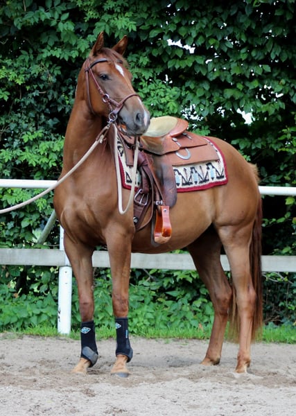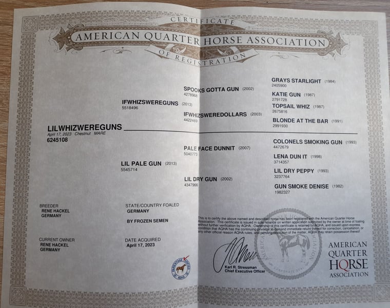 Lilwhizwereguns Spooks Gotta Gun/ Pale Face Dunnit Granddaughter! Born: 17.04.2023 Chestnut "Lilwhizwereguns" is a typey, large-framed chestnut Quarter Horse mare from reining performance lines. She is simply a dream horse with an incredible body and presence. If you are looking for a great reining prospect with immense talent, she is the perfect choice! Also very interesting for breeding later on. 5 Panel N/N Sire is IFWHIZSWEREGUNS: His lifetime earnings are $118,636. He is a full blood brother to SPOOKS GOTTA WHIZ! He was among others EquiStat 2016 19th leading 3-year-old, 2018 14th leading reining horse, 2016 13th Congress Open Futurity, 2016 CHAMPION High Roller Reining Classic Open Futurity, 2016 3rd NRHA Futurity GO2 Open, 2016 21st NRHA Open Futurity, 2017 CHAMPION High Roller Reining Classic Open Stks, 2017 RESERVE CHAMPION High Roller Reining Classic Open Derby, 2017 13th NRHA Open Derby, 2018 3rd Cactus Classic Open Derby, 2018 9th NRBC Open Derby, 2018 4th Reining By The Bay Open Derby and 2018 CHAMPION High Roller Reining Classic Open Derby. Dam of LILWHIZWEREGUNS is Lil Pale Gun by PALE FACE DUNNIT. Pale Face Dunnit's lifetime earnings exceed $72,000. He was USEF National Open Reserve Champion, NRBC Open Classic Finalist, NRHA Open Derby (Top 10), HRRC Open Derby (Top 5), AQHA Performance Register of Merit, JR Reining 7th at the World Show, HRRC Open Derby Res. Champion, NRHA Open Derby (Top 20 Finalist), NRHA Futurity: Open Futurity Finalist (Top 10) (4th in 1st go-round), Scottsdale Open Classic Futurity (tied 3rd), RMRHA Summer Slide Open Futurity Champion. She can be easily tied and groomed, has been regularly dewormed and presented to the farrier. She is already familiar with groundwork, lunging, and the saddle, and is accustomed to rider weight. She is always well-behaved and attentive. She is sold with a DQHA equine passport and AQHA certificate of registration. https://www.allbreedpedigree.com/lilwhizwereguns NRHA Germany SSP paid IRHBA BIP Italy nominated (through sire) www.white-diamond-horses.de