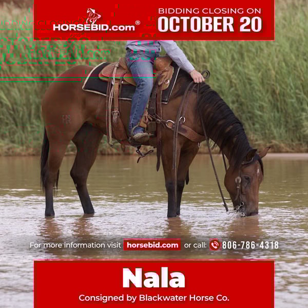 ♦️ 𝐭𝐡𝐞 𝐀𝐌𝐄𝐑𝐈𝐂𝐀𝐍 𝓕𝓪𝓵𝓵 𝓒𝓵𝓪𝓼𝓼𝓲𝓬 ♦️ Happening now thru MONDAY | OCTOBER 20th - Available EXCLUSIVELY on HorseBid's website! For more details and to register visit: www.Horsebid.com CONSIGNOR CONTACT: Blackwater Horse Co. 806-786-4318 LOCATION: Canyon TX BREED: Quarter Horse REGISTERED: Yes REGISTERED NAME: HSR VOODOO LOADED COLOR: Bay HEIGHT: 15 AGE: 3 GENDER: Mare Introducing Nala - This classy 3-year-old mare has all the makings of a top cow horse prospect. She’s been used on the ranch and already carries herself with the kind of confidence and handle you only get from real-world experience. Nala has a solid cow horse foundation—quick-footed, naturally cowy, and soft in the bridle—showing all the raw talent you’d want to finish out into the show pen or keep as a handy using horse. On top of her cow horse ability, she would also make a tremendous rope horse prospect. Nala has got plenty of speed, the athleticism to get across the pen, and the good mind to handle the pressure. Extra willing with a big heart, she’s the kind that gives you 100% every ride. Sound, straight-legged, and correct in her build, she’s made to last and has the mind and ability to excel in multiple arenas. Whether you want to take her to the ranch versatility classes, finish her as a rope horse, or continue her down the cow horse path, this mare has the foundation, talent, and try to go far.