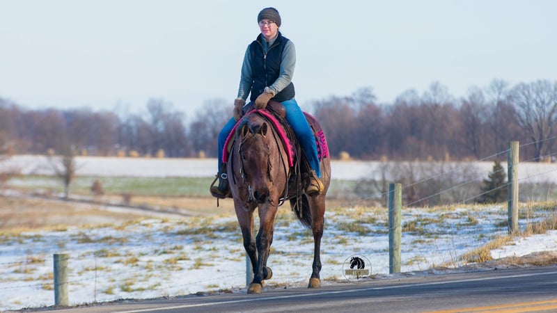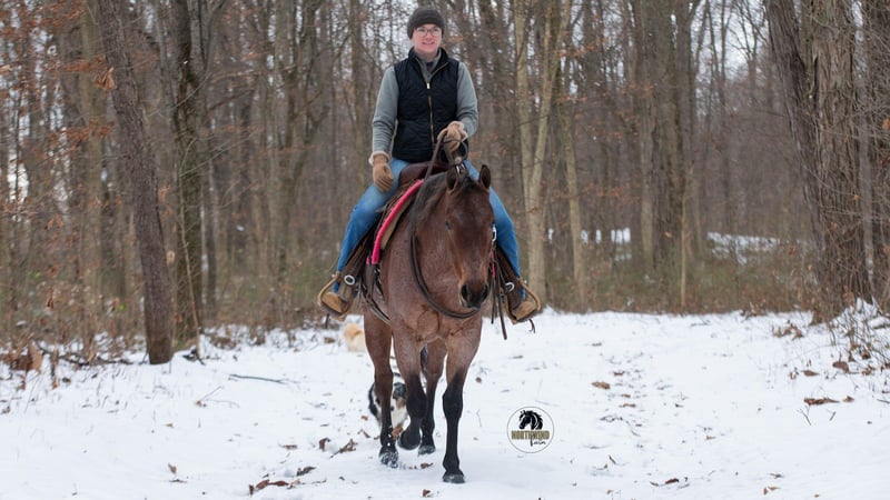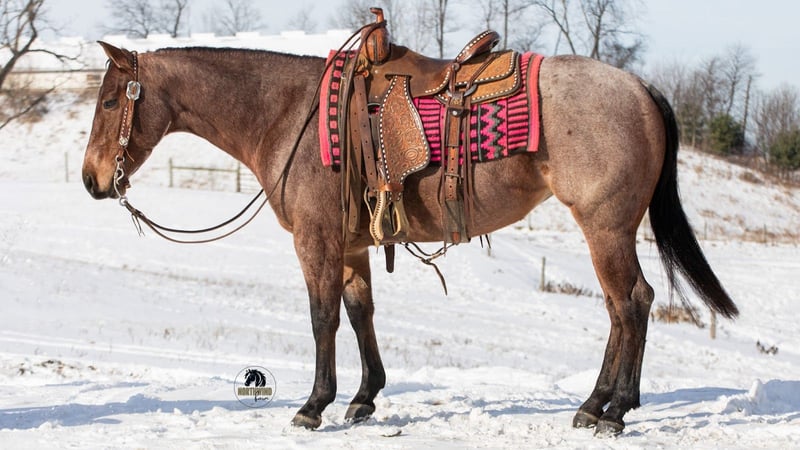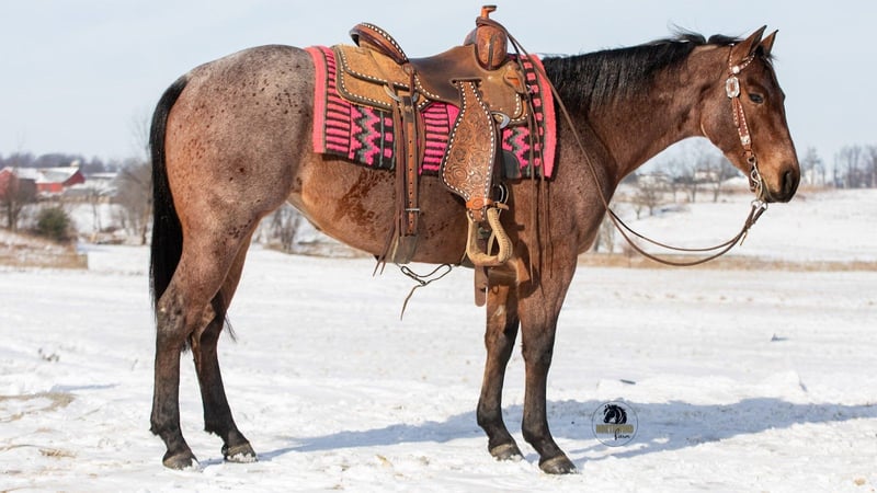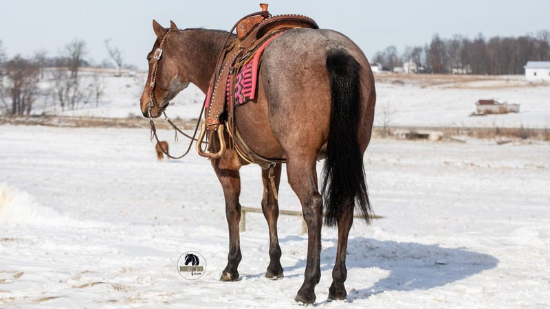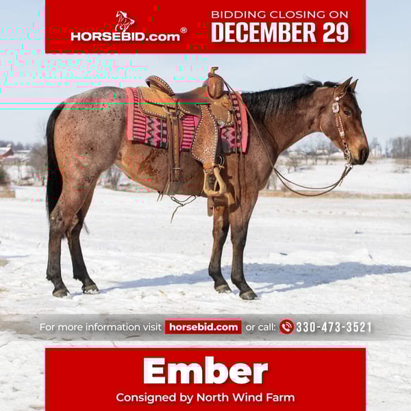 ⚜️ 𝓗𝓮𝓻𝓲𝓽𝓪𝓰𝓮 𝐖𝐢𝐧𝐭𝐞𝐫 𝓒𝓵𝓪𝓼𝓼𝓲𝓬⚜️ Happening now thru MONDAY | DECEMBER 29th - Available EXCLUSIVELY on HorseBid's website! For more details and to register visit: www.Horsebid.com CONSIGNOR CONTACT: North Wind Farm 330-473-3521 LOCATION: Fredericksburg, OH BREED: quarter horse REGISTERED: No COLOR: bay roan HEIGHT: 14.1 AGE: 4 GENDER: Mare Ember is a 4 yr old grade quarter horse mare standing at 14.1hh. She is well trained to ride! Ember is very sweet and gentle. She has good manners! She is a great trail horse and takes new places in stride! She stands nicely to be groomed and for tacking up! She will also stand when getting bathes! She can be turned out with other horses and is easy to catch! She rides great in the arena, she has easy cues and responds well! She has A smooth and is easy to ride walk, trot, lope! She has a nice neck rein and a side pass! She can be rode bareback and bridles! She has a lot of trail experience! She rides through creeks, through brush, and is surefooted! She doesn’t mind the tarp or the ball! She is used to being around dogs and atvs! She can be rode out in the traffic and is traffic safe! She is confident and easy going! Ember is the same horse everyday. She is cute, safe, and so much fun to ride! Ember is looking for her forever person, reach out with any questions you might have about her! ⭐️North Wind Farm is renowned for its quality trail and all-around horses. Our horses are versatile and can excel in any discipline, making them perfect for riders of all levels. Whether you're looking for a reliable trail companion or a horse that can perform in various disciplines, North Wind Farm has the perfect match for you. Our commitment to excellence and passion for equine care ensures that each horse is well-trained, healthy, and ready to meet your needs. Contact us: Tim (330)600-8840 Lisa (330)473-3521
