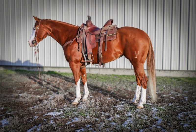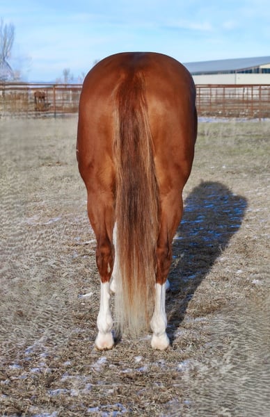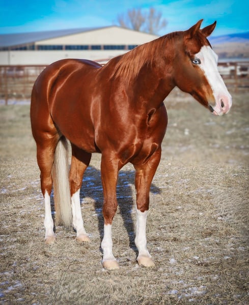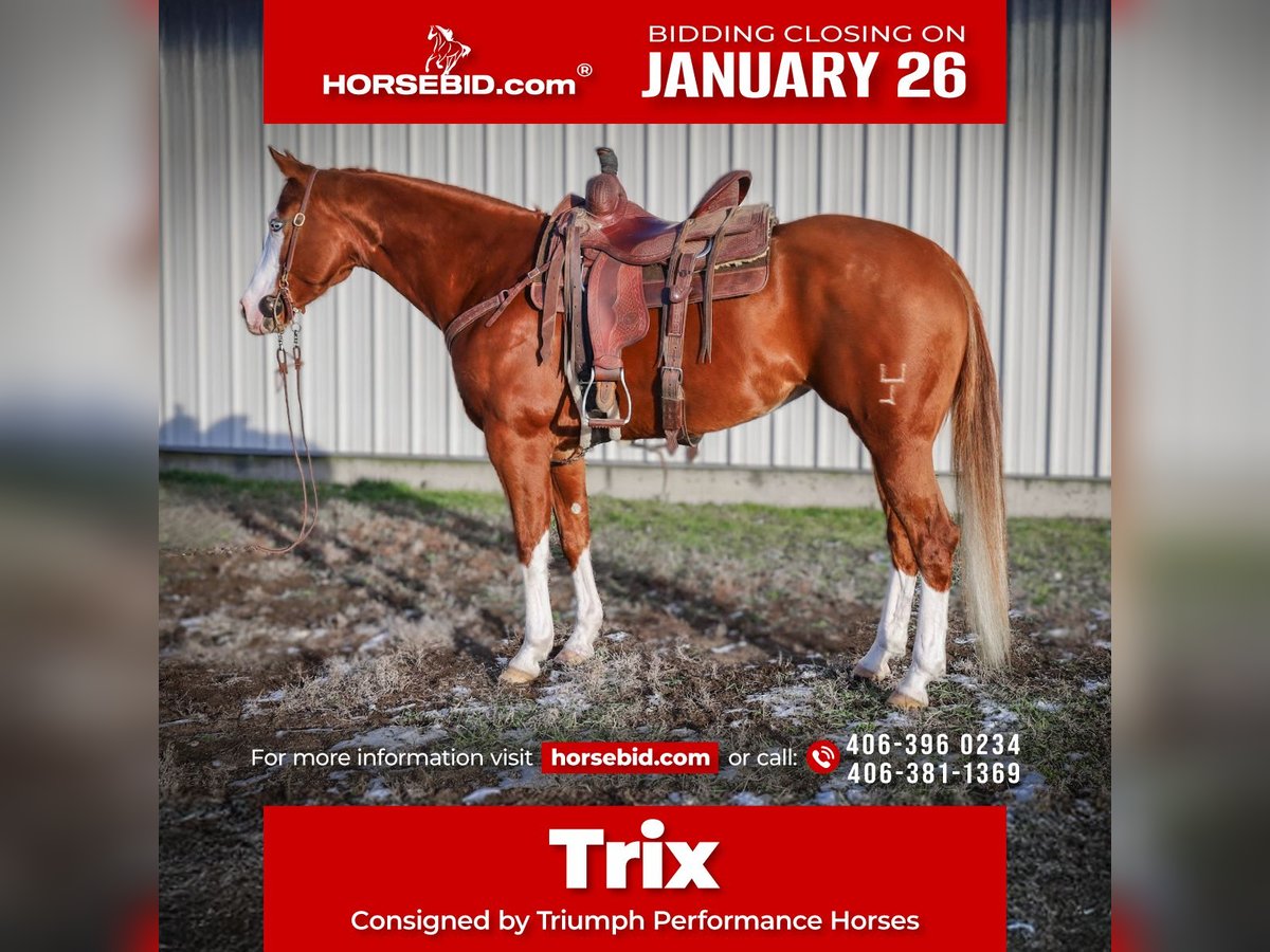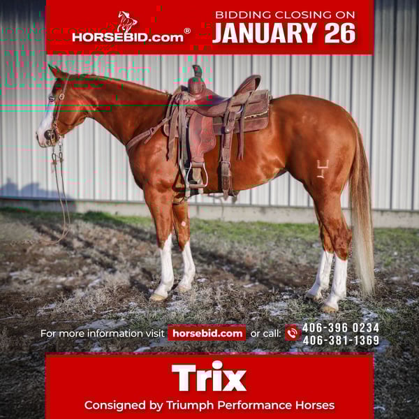 𝐉𝐀𝐍𝐔𝐀𝐑𝐘 ⭐️𝑨𝒍𝒍 𝑺𝒕𝒂𝒓 𝑳𝒊𝒏𝒆𝒖𝒑⭐️ Happening now thru MONDAY | JANUARY 26th - Available EXCLUSIVELY on HorseBid's website! For more details and to register visit: www.Horsebid.com CONSIGNOR CONTACT: Triumph Performance Horses 406-396-0234 & 406-381-1369 LOCATION: Hamilton, MT BREED: AQHA REGISTERED: Yes REGISTERED NAME: Smart Chicks Got Tricks COLOR: Sorrel Splash HEIGHT: 15 AGE: 5 GENDER: Mare 💎 𝚂𝙼𝙰𝚁𝚃𝙲𝙷𝙸𝙲𝚂𝙶𝙾𝚃𝚃𝚁𝙸𝙲𝙺𝚂 — 2021 AQHA Sorrel Splash Mare. 15 hands. True to her name, this “smart chic” has plenty of tricks up her sleeve – all the 𝒓𝒊𝒈𝒉𝒕 ones for her next rider! Sired by the legendary stallion 𝕋𝕣𝕚𝕔𝕜𝕖𝕕 𝕆𝕦𝕥 𝕊𝕡𝕠𝕠𝕜 and out of a ℍ𝕚𝕔𝕜𝕠𝕣𝕪 ℂ𝕙𝕚𝕔 𝕆𝕝𝕖𝕟𝕒 mare, she is a stylish, talented, versatile young mare with every button. Trix is the kind everyone looks for, and few actually find. She stands a true 15 hands with the substance to carry a variety of riders comfortably, and she does it in style — four high white socks, a bald face, black eyeliner, and bright blue eyes that make her impossible to miss. Trix has been started right with no skipped steps. She is broke the way one should be with a solid reining foundation— beautiful walk-to-lope transitions, correct spins and sliding stops, she rides soft in the face, moves off leg and seat with ease, and neck reins lightly one-handed. Trix is sensitive in a good way—light, responsive, and wants to please. She is started on barrels and is currently loping a gorgeous barrel pattern with natural rate and athleticism. She has the foundation to make a competitive barrel horse, go back to reining, or step into ranch versatility, reined cow horse, sorting, roping, or whatever direction you would like to take her. On top of her skills, Trix has a great disposition. In the barn and pasture, she’s good-minded and gentle: easy to catch, not marish, and gets along well in a herd environment. She loves attention, and is good to shoe, haul, saddle, and handle. Trix has been ridden by riders as young as 10, and while she is not suitable for a beginner due to her age and responsiveness, she has all the qualities to mature into a wonderful family horse with time and consistency. Trix is sound, sane, and easy to be around. PPE’s are welcome and encouraged, and buyers are invited to come try her at our home in Hamilton, MT – once you swing a leg over this mare, you’ll fall in love with her style, handle, and willing personality. __________________________________________________________________________________________ 𝑺𝒊𝒓𝒆: 𝐓𝐑𝐈𝐂𝐊𝐄𝐃 𝐎𝐔𝐓 𝐒𝐏𝐎𝐎𝐊 – NRHA LTE $68,000+, NRHA Team Challenge Open Champion, Reining By The Bay L2 & L3 Open Derby Champion, APHA World Reining Open Champion, NRBC Open Derby finalist. Sire of Level 4 Open & Non-Pro Champions with offspring earnings exceeding $715,000. 𝑮𝒓𝒂𝒏𝒅𝒔𝒊𝒓𝒆: 𝐒𝐏𝐎𝐎𝐊𝐒 𝐆𝐎𝐓𝐓𝐀 𝐆𝐔𝐍 – NRHA Open Derby Champion, NRHA Three Million Dollar Sire, LTE ~$81,000+. By 𝐆𝐫𝐚𝐲𝐬 𝐒𝐭𝐚𝐫𝐥𝐢𝐠𝐡𝐭 (cutting horse legend with $10+ million in offspring earnings). Spooks Gotta Gun’s get include NRHA Triple Crown winner Spooks Gotta Whiz. 𝑮𝒓𝒂𝒏𝒅𝒅𝒂𝒎: 𝐑𝐎𝐖𝐃𝐘 𝐁𝐑𝐈𝐍𝐍𝐀 – AQHA mare with produce earnings of $111K+, including 8 AQHA foals age 3 & over, 6 money-earners and 2 AQHA point-earners. By 𝐑𝐨𝐰𝐝𝐲 𝐘𝐚𝐧𝐤𝐞𝐞 (NRHA Hall of Fame stallion, NRHA Non-Pro Futurity Champion, multiple NRBC and major derby titles, an NRHA #1 Junior Sire). 𝑫𝒂𝒎: 𝐂𝐋𝐀𝐑𝐀𝐁𝐄𝐋𝐋𝐄 – By 𝐇𝐢𝐜𝐤𝐨𝐫𝐲 𝐂𝐡𝐢𝐜 𝐎𝐥𝐞𝐧𝐚. 𝑮𝒓𝒂𝒏𝒅𝒔𝒊𝒓𝒆: 𝐇𝐈𝐂𝐊𝐎𝐑𝐘 𝐂𝐇𝐈𝐂 𝐎𝐋𝐄𝐍𝐀 – NRHA LTE $45,601, NRHA Non-Pro Derby Reserve Champion, AQHA Superior Reining Horse, Equi-Stat Leading Reining Sire with offspring earnings of $362,000+ and 790+ AQHA points. By 𝐒𝐦𝐚𝐫𝐭 𝐂𝐡𝐢𝐜 𝐎𝐥𝐞𝐧𝐚 (Hall of Fame reining & cutting horse; LTE $167,000; $13M+ sire across reining/cutting/cowhorse) and out of a 𝐃𝐨𝐜’𝐬 𝐇𝐢𝐜𝐤𝐨𝐫𝐲 mare. 𝑮𝒓𝒂𝒏𝒅𝒅𝒂𝒎: 𝐌𝐘 𝐃𝐀𝐑𝐋𝐈𝐍 𝐂𝐋𝐄𝐌𝐈𝐍𝐓𝐈𝐍𝐄 – By 𝐂𝐡𝐢𝐜𝐬 𝐑𝐞𝐝 𝐅𝐨𝐱