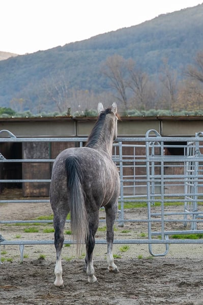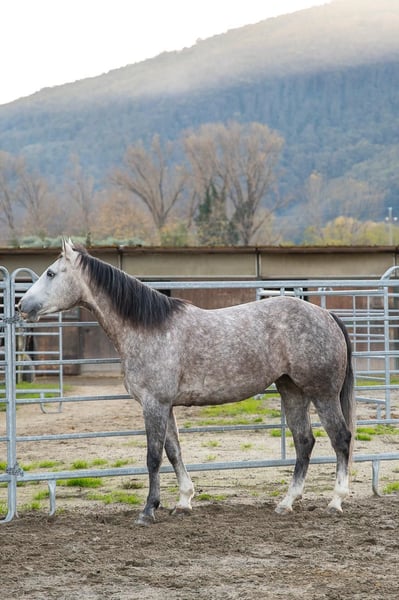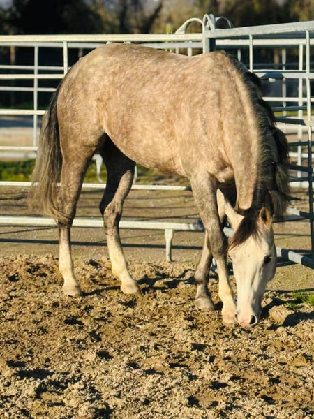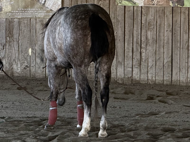 Elegant American Quarter Horse mare, born in 2021, with a striking grey coat that catches the eye. Standing at approximately 155 cm at the withers, she combines a compact, muscular build with a balanced conformation, making her an ideal partner for a variety of disciplines. This well-bred mare has been trained and ridden primarily in Western discilplines, showcasing a calm and willing temperament that makes her suitable for both experienced riders and those looking to develop their skills. Her smooth gaits and responsive nature ensure a comfortable ride, whether in pleasure riding, trail work, or more advanced Western disciplines. She has never been shown cause we weren’t interested in competitions Her youth and excellent pedigree promise a bright future, and her friendly, cooperative attitude makes her a pleasure to handle. Whether you're a seasoned rider seeking a reliable partner or a passionate enthusiast eager to bring a promising mare into your stable, she offers great potential and a lovely presence. A true gem for anyone looking to add a versatile and well-started Quarter Horse mare to their herd. Clean X Rays available (march 2026) Video on demand