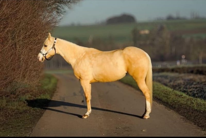 Beautiful Quarter Horse mare Mizzen Queen "Honey", born April 14, 2020, is unfortunately looking for a new home as she does not get along with our young gelding, causing extreme stress. She is coming from our herd. About Honey: She is a stunning, petite mare in the rare Palomino color with a white face and two blue eyes. The little mare stands at 145 cm (14.1 hh). Sire: The Gunner King (COLONELS SMOKING GUN) Dam: Frozen Mizzen (FROZEN SAILOR / REMINIC) She has AQHA papers and a passport. Honey is a submissive mare and feels most comfortable in an open stable setting. In her previous home, she showed signs of bond anxiety (tendency to weave) in the paddock box. We did not observe this behavior with us, not even during her integration in a separated area similar to a paddock box. She was likely shod fully in the past. With us, she has recently been barefoot and has shown no issues so far. The mare previously had basic training, probably in reining (more details can be provided in personal contact), and was ridden sporadically by a youth rider. Before that, she was kept more or less standing for about a year, so she lacks muscle development and would need to be rebuilt. In the short time with us, we have not ridden her, as we wanted her to settle in and build up from the ground. Her teeth were checked in 2025, and she was also osteopathically examined before her move to us. Honey is a sweet, especially cool and fearless mare. When the herd is startled, she only flinches briefly and observes. Even when removing the tack (she has only been here one day), she remained completely relaxed. Dogs and cats running around her do not bother her, nor do tractors or snowplows passing directly in front of her eyes. Honey is not suitable as a weight-carrying horse or beginner horse, as she needs a confident handler who can provide her security at the beginning. We are looking for a person with heart and understanding who accepts her as she is, gives her time, and helps her settle in. She will be a fantastic partner for her person. Possibly also interesting for breeding. Honey is looking forward to serious inquiries and visits in 89561.