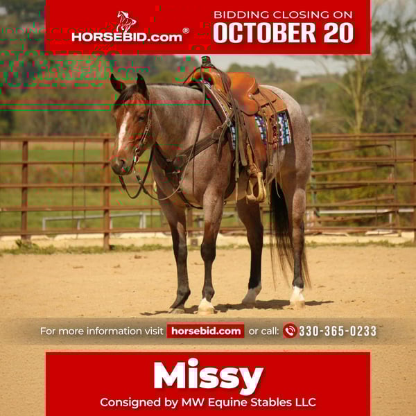 ♦️ 𝐭𝐡𝐞 𝐀𝐌𝐄𝐑𝐈𝐂𝐀𝐍 𝓕𝓪𝓵𝓵 𝓒𝓵𝓪𝓼𝓼𝓲𝓬 ♦️ Happening now thru MONDAY | OCTOBER 20th - Available EXCLUSIVELY on HorseBid's website! For more details and to register visit: www.Horsebid.com CONSIGNOR CONTACT: MW Equine Stables LLC 330-365-0233 LOCATION: Fresno, OH BREED: AQHA REGISTERED: Yes REGISTERED NAME: Flit Miss Decade COLOR: Bay Roan HEIGHT: 14.3 AGE: 5 GENDER: Mare Missy is an AQHA 5 yr old mare 14.3 HH.. She is an outstanding mare that is an absolute pleasure to be around. She is perfect for the entire family. She has a nice enough handle to do any job with, as well as take to the show pen or arena. Missy is honest! Even with time off, she will saddle up and ride off without trouble. She is very forgiving when being ridden by an inexperienced rider. Missy is traffic safe and rides out great alone or with the group. She is an expert in the arena, great on trails, crossing creeks, logs, and other obstacles with ease. Missy has a nicely balanced trot and canter.. She picks up both leads on cue, lopes correct circles, has a nice stop. She is very well desensitized and could excel in ranch show classes or make a solid ranch horse that the entire family can use. She is comfortable around other small/large livestock, pets, and small children. Missy is a very quiet, laid-back, safe mare that is a Sweetheart to everyone. She does well stalled or turned out with other horses. She is easy to catch when turned out. Missy is easy to shoe and has good feet. If you're looking for an incredibly nice mare, that's as honest as the day is long, look no further than Missy ! If you have any additional questions, or would like to meet Missy prior to the auction ending, please do not hesitate to call Marcus at 330-365-0233