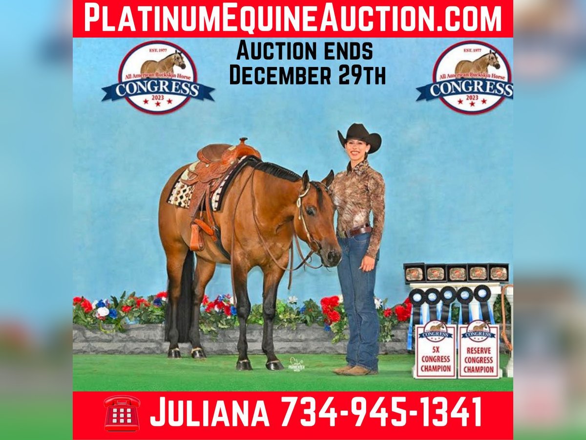 ONLINE AUCTION Place your bids at www.PlatinumEquineAuction.com Starting Bid $3500 Auction ends December 29th, 2024 Need a new saddle? Check out White Rock Saddles on our website or Facebook! Ramona Dun Did It Aka Reba is a 2020 registered AQHA/NSBA/IBHA/ABRA 15.2 hand mare looking for a new home! Don’t let her age fool you; she’s done it all with a quiet, easy-going personality! She has shown all around the last two years, everything from trail to showmanship. Reba could easily switch and excel in the ranch division. She has been leased out to junior and high school equestrian team students for the last two years; the kids love her! Easy keeper, no vices, and no maintenance. Ridden in parades as a 3yo for my high school students during homecoming season and has continued participating in multiple parades since. 5x Buckskin Congress champion 2023. Register of Merit and Honor Roll awards from ABRA. GLBA Queen Horse 2023. Has been started over low fences. Also been on trails. Negative Coggins and UTD on shots and worming. Teeth were done in the spring. Located in Hamilton, AL. Contact Juliana Juback 734-945-1341 with any questions. ONLINE AUCTION Place your bids at www.PlatinumEquineAuction.com Starting Bid $3500 Auction ends December 29th, 2024 Need a new saddle? Check out White Rock Saddles on our website or Facebook!