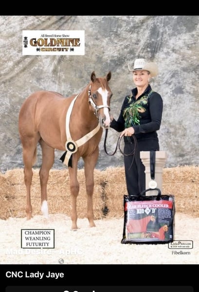 ONLINE-AUKTION Geben Sie Ihre Gebote auf www.PlatinumEquineAuction.com ab Startgebot 3500 $ Die Auktion endet am 9. Februar 2025 Brauchen Sie einen neuen Sattel? Schauen Sie sich White Rock Saddles auf unserer Website oder Facebook an! CNC Lady Jaye, auch bekannt als Lady, ist eine registrierte Champion-Stute und eine atemberaubende Appaloosa. Sie wurde am 26. Februar 2018 geboren. Sie hat eine beeindruckende Größe von 16,1 Händen und eine schöne Konformation. Dieses Mädchen macht Spaß; sie hat einen schönen erweiterten Trab und trägt sich gut. Sie eignet sich hervorragend als Englischpferd mit ihrer fließenden Bewegung. Lady wurde für Ausritte verwendet und ist sehr einfach zu handhaben. Sie geht jeden Trail hinauf oder hinunter, meistert umgefallene Bäume, Gestrüpp, Gräben und überquert Wasser, während sie ruhig bleibt. Sie ist ein freundliches Pferd, das sanft ist und bereit ist, neue Dinge auszuprobieren. Sie hat Rinder zusammengetrieben und wurde auch genutzt, um Zäune auf der Ranch zu überprüfen. Lady wurde in einigen Halfterklassen gezeigt und war Champion bei den Absetzerfohlen, zudem hat sie in mehreren anderen Halftermeisterschaften Platzierungen erzielt. Sie hat auch an einigen 4-H-Shows in Trail und Equitation teilgenommen und hat erfolgreich im Halfter gezeigt. Wenn Sie ein wenig in alles reinschnuppern möchten, wäre sie eine großartige Wahl für Sie. In der Arena nimmt sie ihre Führungen auf, hat einen sanften Halt und einen natürlich gesammelten Rückwärtsgang. Ihre Bewegung ist sehr flüssig und schön. Sie ist bereit, in jede Richtung zu gehen, in die Sie sie führen möchten. Sie ist äußerst willig, hat keine Albernheiten und möchte einfach Ihr Freund sein. Lady hat Hindernisse wie Reifen und Brücken mit Leichtigkeit gemeistert und hat wirklich Gefallen daran gefunden. Sie ist einfach zu beschlagen, zu scheren und zu baden. Sie lädt problemlos und transportiert sich gut und hat keine schlechten Gewohnheiten. Bitte kontaktieren Sie die Longhorn Ranch, Dina, die sich in Paicines, CA, befindet, unter 831-537-1915. ONLINE-AUKTION Geben Sie Ihre Gebote auf www.PlatinumEquineAuction.com ab Startgebot 3500 $ Die Auktion endet am 9. Februar 2025 Brauchen Sie einen neuen Sattel? Schauen Sie sich White Rock Saddles auf unserer Website oder Facebook an!