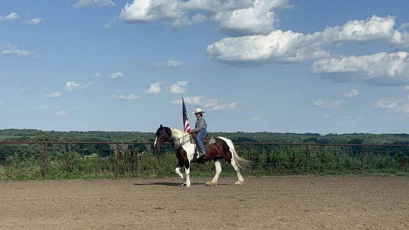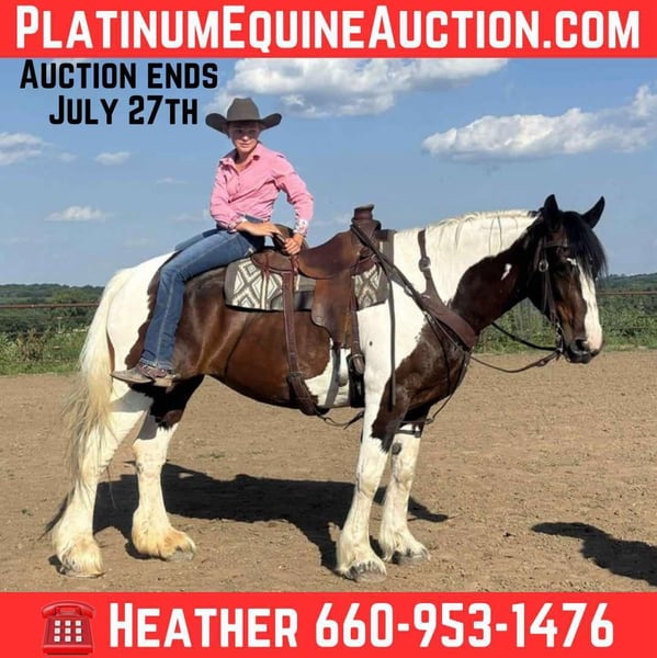 NLINE AUCTION Place your bids at www.PlatinumEquineAuction.com Starting Bid $3500 Auction ends July 27th 2025 Need a new saddle? Check out White Rock Saddles on our website or Facebook Lily – Stunning 7-Year-Old Gypsy Cross Mare Looking for your next safe, sound, and stunning ride? Meet Lily, a 7-year-old Gypsy cross mare who turns heads wherever she goes! Highlights: • Absolutely gorgeous and well-built • Stands 16.2hh • Leads, loads, ties, and stands great for the farrier • Rides English and Western • Trail rides like a seasoned pro • Traffic safe and unbothered by new surroundings • Rides quiet and steady—perfect for any rider, any level • 100% sound with a 30-day soundness guarantee Whether you’re looking for a family-safe trail companion or a reliable all-around mount, Lily checks every box. Great ground manners, easy to handle, love attention and wants to please! Give us a call and schedule a ride on her! Located in Princeton, Mo Contact Heather Stark 660-953-1476 Don’t miss your chance to own this gentle and versatile beauty! ONLINE AUCTION Place your bids at www.PlatinumEquineAuction.com Starting Bid $3500 Auction ends July 27th 2025 Need a new saddle? Check out White Rock Saddles on our website or Facebook