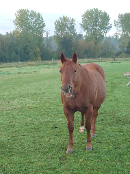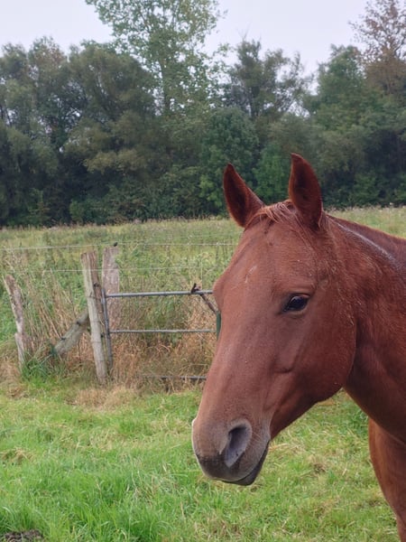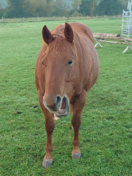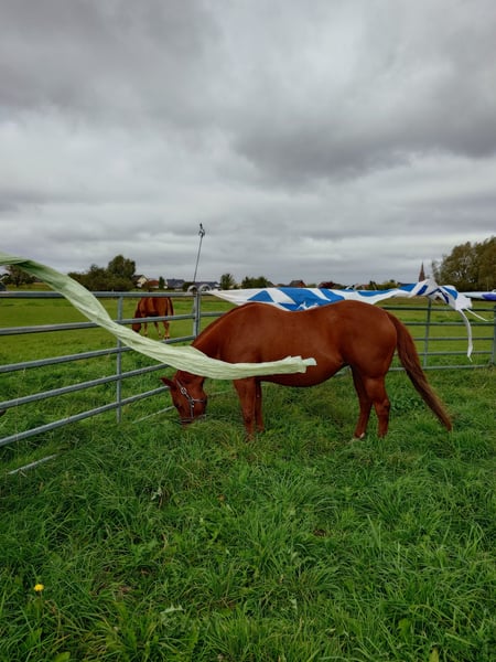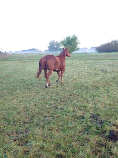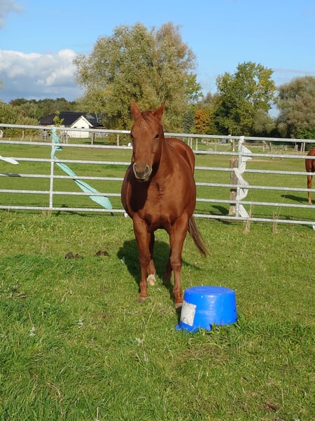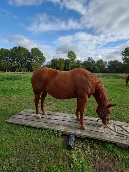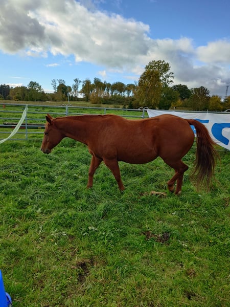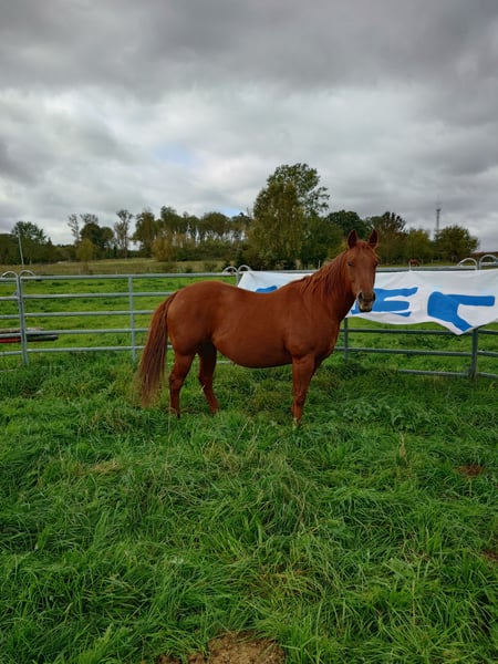 Colonels Rooney, une très jolie jument Quarter, née le 24 mars 2016, est actuellement en pension. En raison du diagnostic de Kissing Spines, elle est proposée à la vente à un prix inférieur, car elle ne peut plus être utilisée comme cheval de randonnée ou pour le travail à la ferme, bien qu’elle ait été jusque-là utilisée pour des sorties en extérieur et du travail avec le bétail. Elle vit au paddock mais connaît également les box (lors de stages). Elle s’intègre bien socialement, étant plutôt de rang inférieur. En daily handling, elle est amicale, curieuse et facile à manipuler. Elle mène très bien en licol et apprend rapidement. Elle est hongre bai, ses dents ont été faites il y a 25 mois, et ses vermifuges, vaccinations ainsi que le maréchal sont à jour. Sa santé est excellente, aucun défaut connu. Notre clinique équine, située à 5 minutes, peut examiner le cheval à tout moment. Elle est fiable lors du travail à la longe et en round pen. Si un renforcement musculaire est souhaité, son équipement peut être repris (la selle, âgée de 2 ans, est adaptée) avec une réduction de prix correspondante. À ses côtés, elle possède également sa pouliche de 2024, bien entendu avec papiers et test de panel, qui peut être achetée avec elle, car nous cessons toute activité d’élevage pour des raisons d’âge. Il ne s’agit pas d’une vente d’urgence ; si je la vends dans deux ans, cela me conviendra aussi.