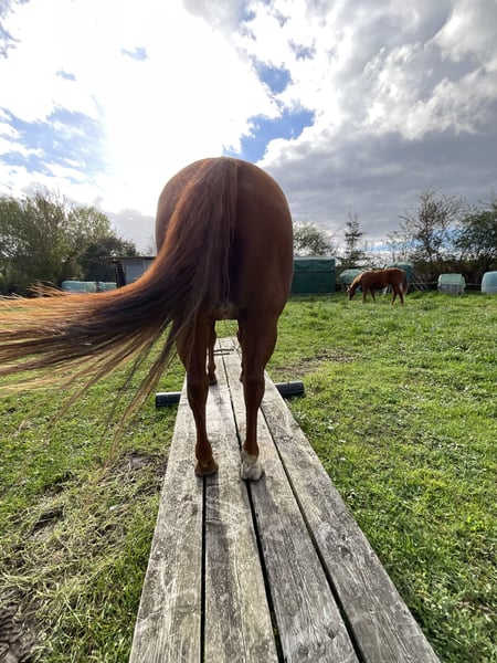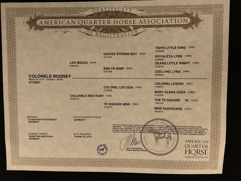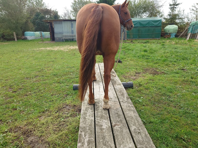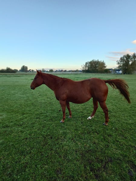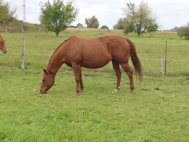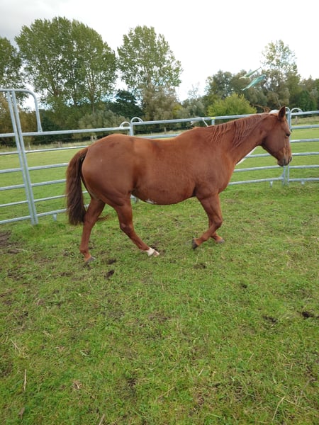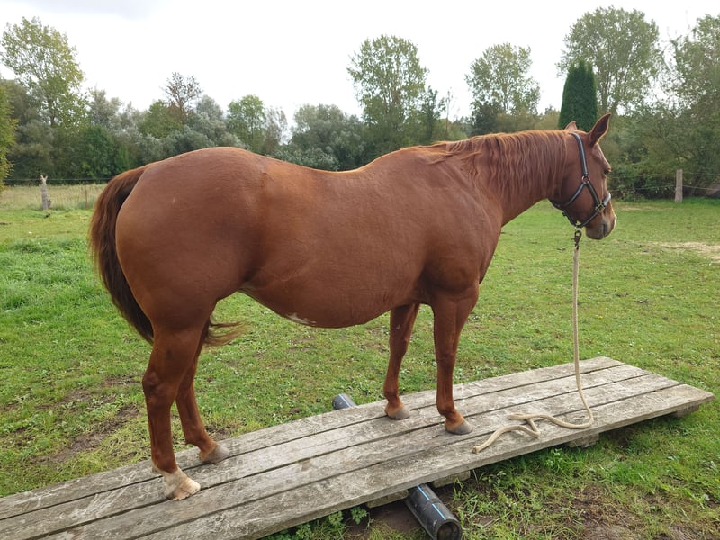 Colonels Rooney sehr hübsche Stute im Quarter tüpp stehend geboren am 24.3.2016 auf Grund der Diagnose Kissing spines wird sie unterm wert verkauft damit nicht als Reitpferd was sie bis her war (Ausritte + Rinder). Sie lebt im Offenstall kennt aber auch Boxen(bei Lehrgängen) sie ordnet sich sozial gut ein ist eher rangniedrig. Im täglichen Umgang ist sie Freundlich und aufgeschlossen gut Halfter führig sie lernt sehr schnell. Sie ist Barhufer, Zähne sind 25 gemacht Wurmkur und Impfungen sowie Hufschmied sind selbst verständlich. Gesundheitlich weiterhin sind keine Mängel bekannt unsere Pferdeklink ist 5Minuten entfernt dort kann alles eingesehen werden. Sie ist bei der Bodenarbeit und im Roundpen unauffällig. Wenn Muskel aufbauen gemacht werden sollte kann ihr Equipment mit übernommen werden (Sattel ist 2 Jahre alt und angepasst) mit entsprechenden Preis Nachlass. Zur Seite hat sie noch ihr Stutfohlen aus 2024 natürlich mit Papieren und Panel Test was mit erworben werden kann dar wir die Pferde Haltung aus Altersgründen komplett aufgeben. Dies ist kein Notverkauf wenn ich in 2 Jahren Verkaufe ist es auch gut.
