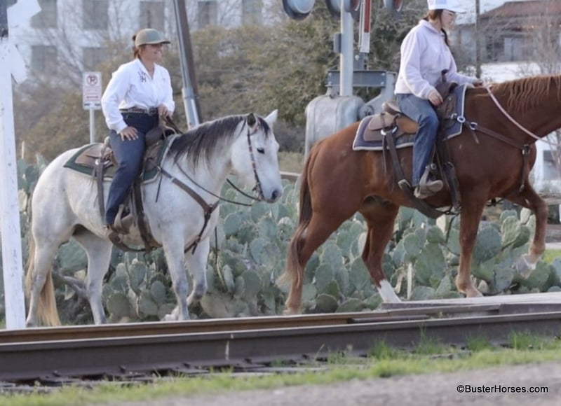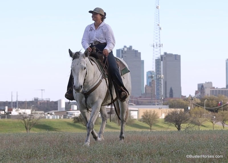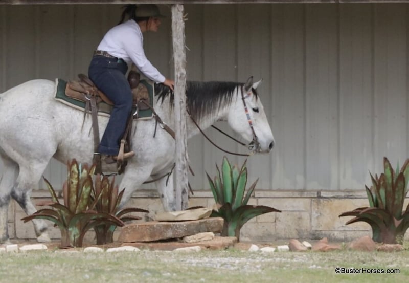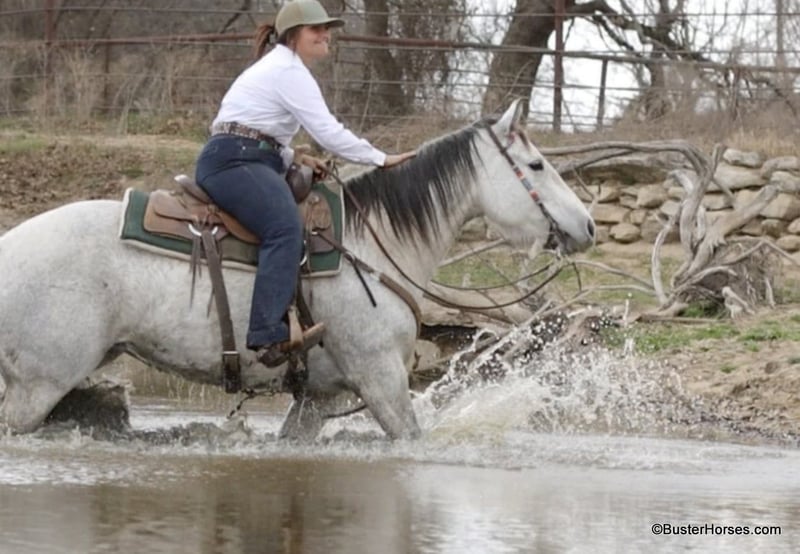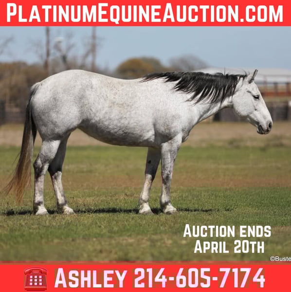 ONLINE AUCTION Place your bids at www.PlatinumEquineAuction.com Starting Bid $3500 Auction ends April 20th, 2025 Need a new saddle? Check out White Rock Saddles on our website or Facebook! Ladys Cause aka Penelope, is as shapy, T-H-I-C-K, gentle, and as laid-back of a mare as you can find. This bigger than life, 14.3h, gorgeous mare has her entire life ahead of her – at the perfect, ideal, prime age of 8 years old. And it is not everybody’s guess on her age,… she is AQHA registered. This big hunk of a mare, looks like this coming straight out of the pasture from being turned out this winter! We just moved her to the fitting barn to get bloomed and shined up. She is already stunning as she is, an incredibly pretty mare – she will knock your socks off coming out of the fitting barn… this is how she looks just straight out of the pasture! She has great feet and could go barefoot or in shoes. She is great for the farrier, easy to catch, bathes, loads, hauls well, and she stands quietly to be groomed, saddled, and easy to bridle. She stands flat-footed and doesn’t move a foot for mount and dismount. She rides out alone just as well as she does with others, and she is content to go anywhere in the group – she’ll lead, or be in the middle, or fall behind at the back of the line. She is confident in new situations, and she was absolutely great in town. She loves terrain, she will tackle anything you put in front of her, and she absolutely loves the water! She rides around on a nice long relaxed rein, she is easy going and one of those that you kind of have to pedal up into a trot and a lope, she doesn’t hesitate to stop – definitely more whoa, than go. Check back on our Facebook page and our website for updates on this gorgeous mare, we are excited to see how she looks after she is legged up and in the fitting barn for a couple weeks! Please call anytime if you have any questions about her Contact Buster Horses Ashley 214-605-7174 Penelope is located in Weatherford, TX – one hour from Dallas / Fort Worth International Airport. She is an easy day trip or fun overnight trip to come try out, from anywhere! We are experienced knowledgeable sellers and we can help with quickly arranging affordable shipping to any buyer’s location – we have experience shipping horses worldwide – including regularly to Hawaii, Canada, Mexico, Europe, and South Africa. Go to our Facebook page Buster Ranch and check our website for buyer reviews, for more videos, additional info, etc: https://busterhorses.com/Ladys-Cause ONLINE AUCTION Place your bids at www.PlatinumEquineAuction.com Starting Bid $3500 Auction ends April 20th, 2025 Need a new saddle? Check out White Rock Saddles on our website or Facebook!