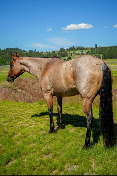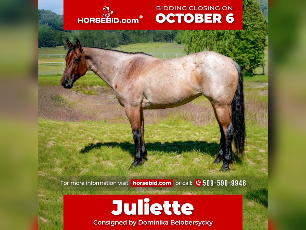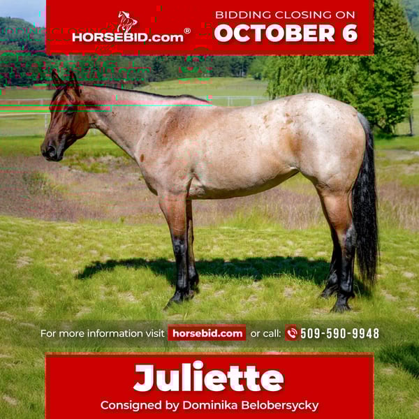 🍂 𝓐𝓾𝓽𝓾𝓶𝓷 𝑨𝑳𝑳 𝑺𝑻𝑨𝑹 𝑳𝑰𝑵𝑬𝑼𝑷 🍂 Happening now thru MONDAY | OCTOBER 6th - Available EXCLUSIVELY on HorseBid's website! For more details and to register visit: www.Horsebid.com CONSIGNOR CONTACT: Dominika Belobersycky 509-590-9948 LOCATION: Spokane, WA BREED: Quarter Horse REGISTERED: Yes REGISTERED NAME: FABS TYZA JULIETTE COLOR: Bay Roan HEIGHT: 15.2 AGE: 8 GENDER: Mare Juliette is as nice to ride as she is to look at. This striking 8 year old mare is skilled in a variety of disciplines and ready to give her all to her rider. Very tuned in and willing to please. This horse wants to do what you ask of her and adapts to whatever job she is asked to do. She has been ridden by youth riders and professionals. With experience in ranch classes, cattle sorting, drill, in-hand, hunt seat, dressage, just to name a few, she can do it all. She has jumped up to 2’9”. Great on the trail, take her through water, trees, narrow trails and steep hills. She is great with other horses or you can take her out solo in wide open fields. Even ridden through a McDonald’s drive through! Juliette is a perfect partner for your adventures. She is the ideal mix of strong and powerful as well as gentle and sensitive. Hauls and stalls well. Really connects to her rider, Juliette loves to have a person and wants to go to work for you. Sound, strong, clean legs and good feet. She can be ridden bareback and bridle-less. Responds to light cues of seat and leg just the way you’d like. Ready to excel at whatever you’ve got in mind. Juliette is the full package of beauty, brains and athletic ability.