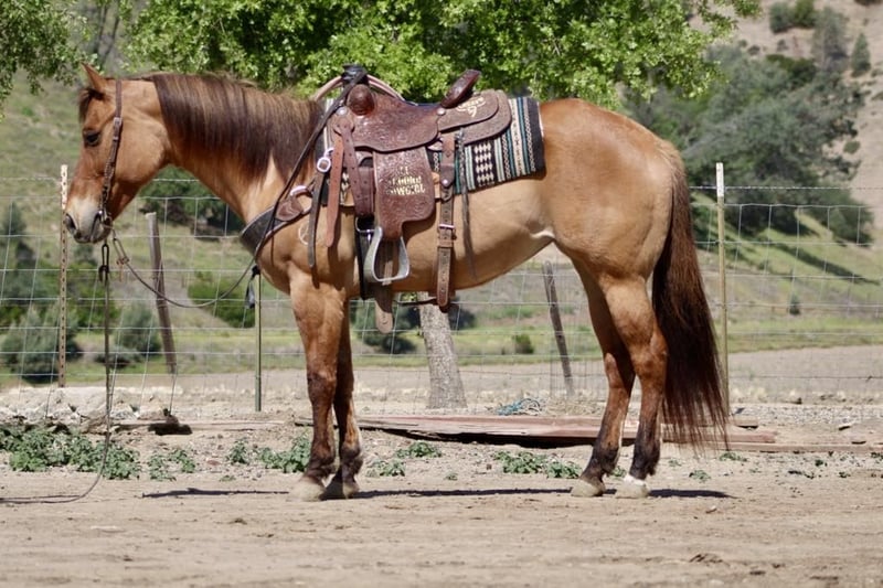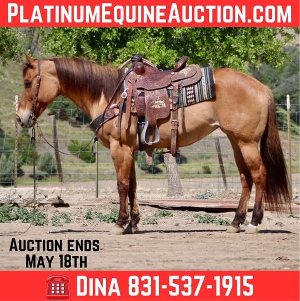 ONLINE AUCTION Place your bids at www.PlatinumEquineAuction.com Starting Bid $3500 Auction ends May 18th, 2025 Need a new saddle? Check out White Rock Saddles on our website or Facebook! This mare is a beautiful dun. She stands at 14.3 hands, is 8 years old, and is a broke mare nice to ride. She is friendly and easy to be around, and she is a total love. She enjoys people and is easy to ride. She is one-hand neck rein broke and eager to please. She lopes nice, correct circles and executes smooth stops and easy backups. She has a nice little turnaround also. Bestie is a great trail partner; she navigates trails with ease. She will go up or down any trail, over trees and logs, and walks right through water. Bestie will go over all the trail obstacles, covered wagon bridges, tires, and all—no problem for this girl. Flags, tarps, and bouncy balls are all met with confidence. She has been used to gather cows and likes to work them started on the lead steer and would make a fun heel horse. Bestie is easy to clip, bathe, and shoe. She loads well and hauls great. She can be pastured or stalled, and she goes out alone or in group settings. Please contact Dina at Longhorn Ranch 831-537-1915 Located in Paicines, CA. I would love to discuss this pretty girl with you so give us a call! ONLINE AUCTION Place your bids at www.PlatinumEquineAuction.com Starting Bid $3500 Auction ends May 18th, 2025 Need a new saddle? Check out White Rock Saddles on our website or Facebook!