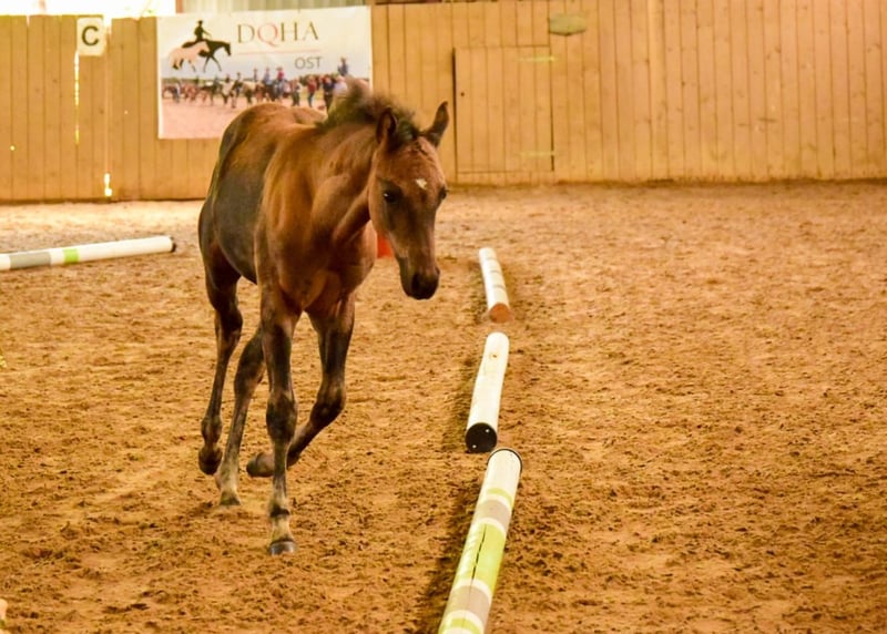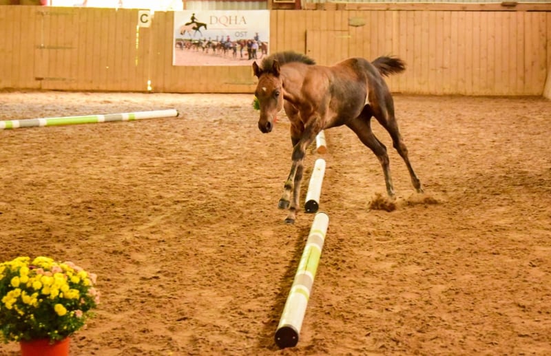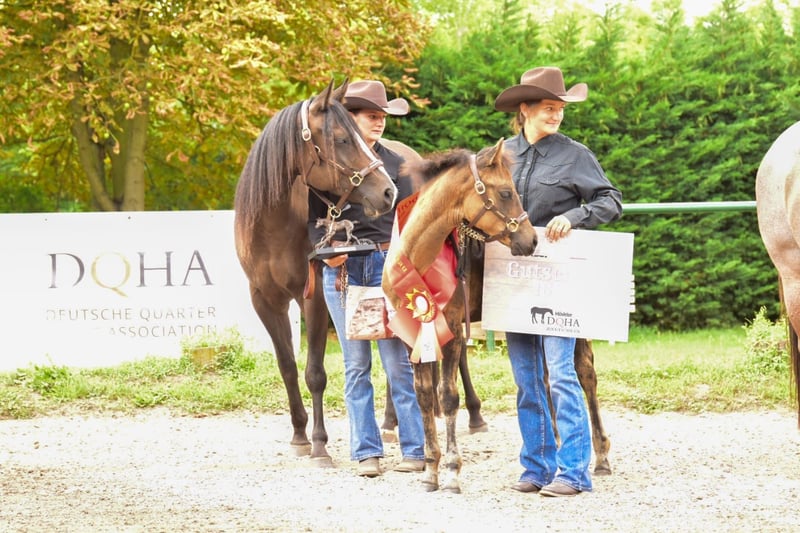 Expressive, stunning AQH mare seeking her 5-star home from November/December. Josie was born on May 1st, 2025, and is a correctly built, light-footed, personable little mare in the dream color Dark Buckskin. She is currently growing up appropriately in a mixed herd and is already halter-trained. Hoof handling, leading, and loading have also been practiced diligently. At the DQHA Höveler Breeding Show 2025, she already caught everyone's eye and presented a very typey AQH, which led to her winning the Sieger Trophy. Her pedigree traces back to the old Quarter line x Foundation / Reining, promising a versatile all-round talent in the future. Both parent horses can be viewed on-site and are tested N/N for 5-panel and 6-panel genetic testing. Josie already has a stylish CORE and will receive a DQHA passport. Please feel free to contact me for further questions.