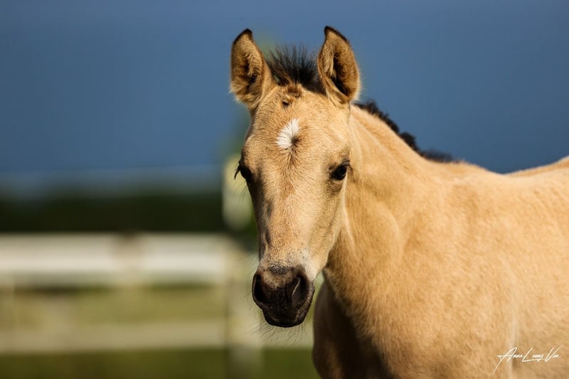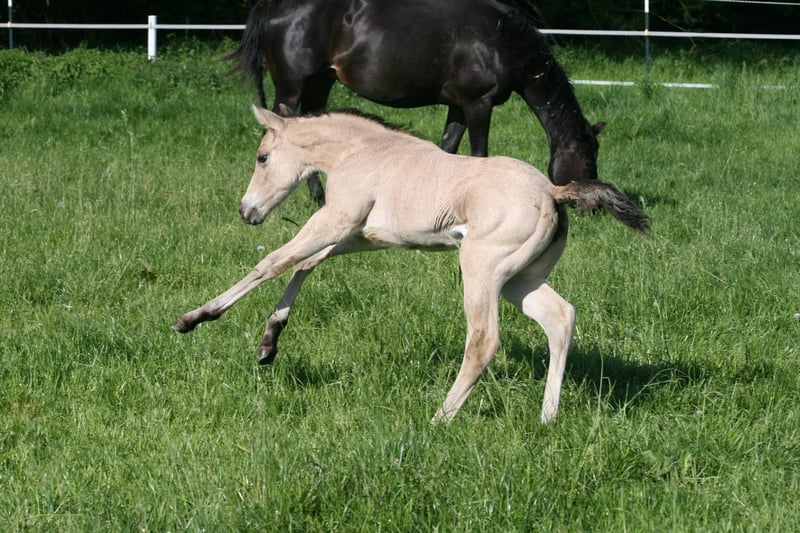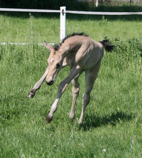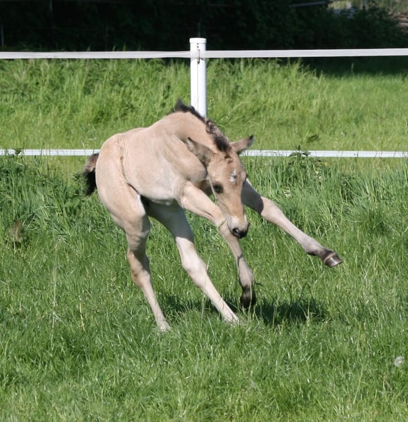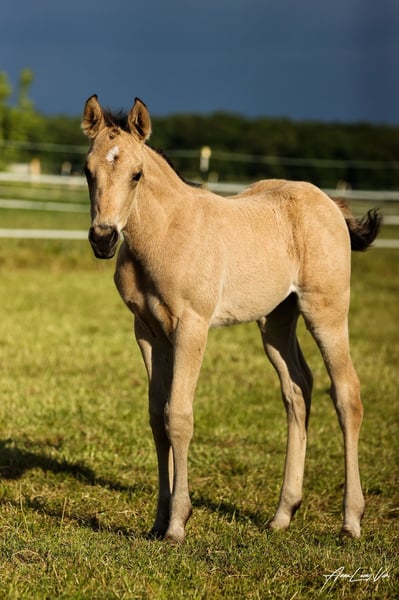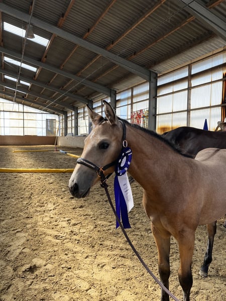 Wir verkaufen unsere ‚April‘ aka KK Best Twist N Step. Sie wurde am 29.04.2025 geboren. Ihre Mutter ist Best Of Invy, eine Tochter von Invy This Playgirl, einer hocherfolgreichen Allaround Stute. Diese ist von Green With Invy. Väterlicherseits ist sie über Double Goodness gezogen. Ihr Vater ist Golden Twist N Step ist unter anderem Dt. Meister EWU Junior Western Ranch Rail 2023 und Vize Dt. Meister Junior Western Riding 2024. In 2025 wurde er Int. Deutscher Ranch Trail Champion der DQHA und gewann Bronze in der Working Rail auf der Q25. Mit sieben Jahren hat er schon über 1.000 EWU Punkte und folgende Pferdemedaillen erreicht: Gold Western Ranch Rail Gold Trail Silber Ranch Riding Bronze Western Riding Auf der Q25 wurde er im Bundeschampionat der Wallache Reserve Champion. Über die Eltern ist sie 5 Panel n/n. Bei der Geburt sah sie eindeutig nach Buckskin aus, im ersten Fellwechsel erschien ein dicker Aalstrich. Da der Vater d/nd1 ist kann sie auch Dun oder Pseudo-Dun sein. Bei der Zuchtschau am 10.08.25 in Ennigerloh wurde sie mit 80,91 % als bestes Stutfohlen bewertet und erhielt damit die 1A Fohlenprämie der DQHA. Außerdem wurde sie Reservesieger der gesamten Schau. Auf dem Bundesfohlenchampionat der DQHA am 11.10.2025 präsentierte sie sich gut und belegte den 14. Platz. Leider hatte sie kurz vor der Schau einen starken Wachstumsschub und war etwas überbaut. Vor allem aber war sie während des gesamten Abenteuers total brav und mutig. April war zur Schau schon abgesetzt und fuhr also ohne Mama. Unsere Fohlen werden regelmäßig mineralsiert und entwurmt. Sie könnte zur weiteren Aufzucht bei uns bleiben. Aktuell lebt sie in einer Fohlengruppe im Offenstall. Meldet euch bei Fragen gerne einfach bei mir. www.kk-Westerntraining.de 0176 1474 1474 Kerstin Averwald Wessenhorst 15 59320 Ennigerloh