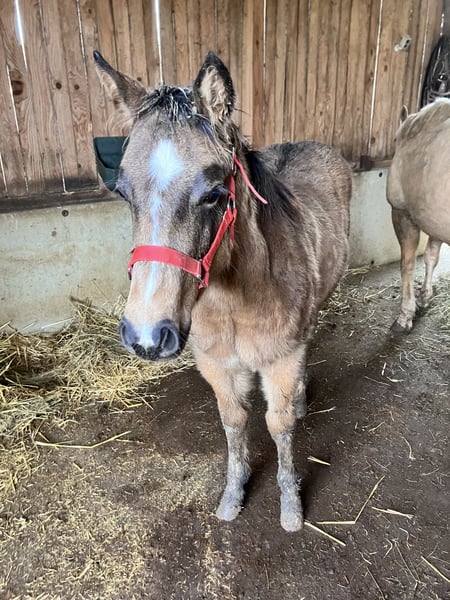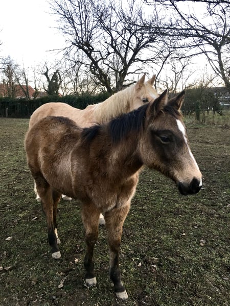 LILLY RUF DUN IT Pouliche Quarter Horse Buckskin née le 08/06/2025 6 panels tests négatifs Très belle morphologie, proche de l'homme. Origines reining/ranch Par SHINING BLISS CT (LIL RUF PEPPY) et BOOGIES DUN IT NAHR (BOOGIES FLASHY JAC) Marche en licol, donne les pieds, monte en van. Localisation: Moselle FRANCE (proche frontière allemande)