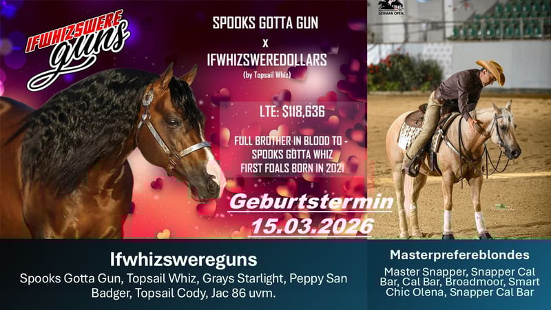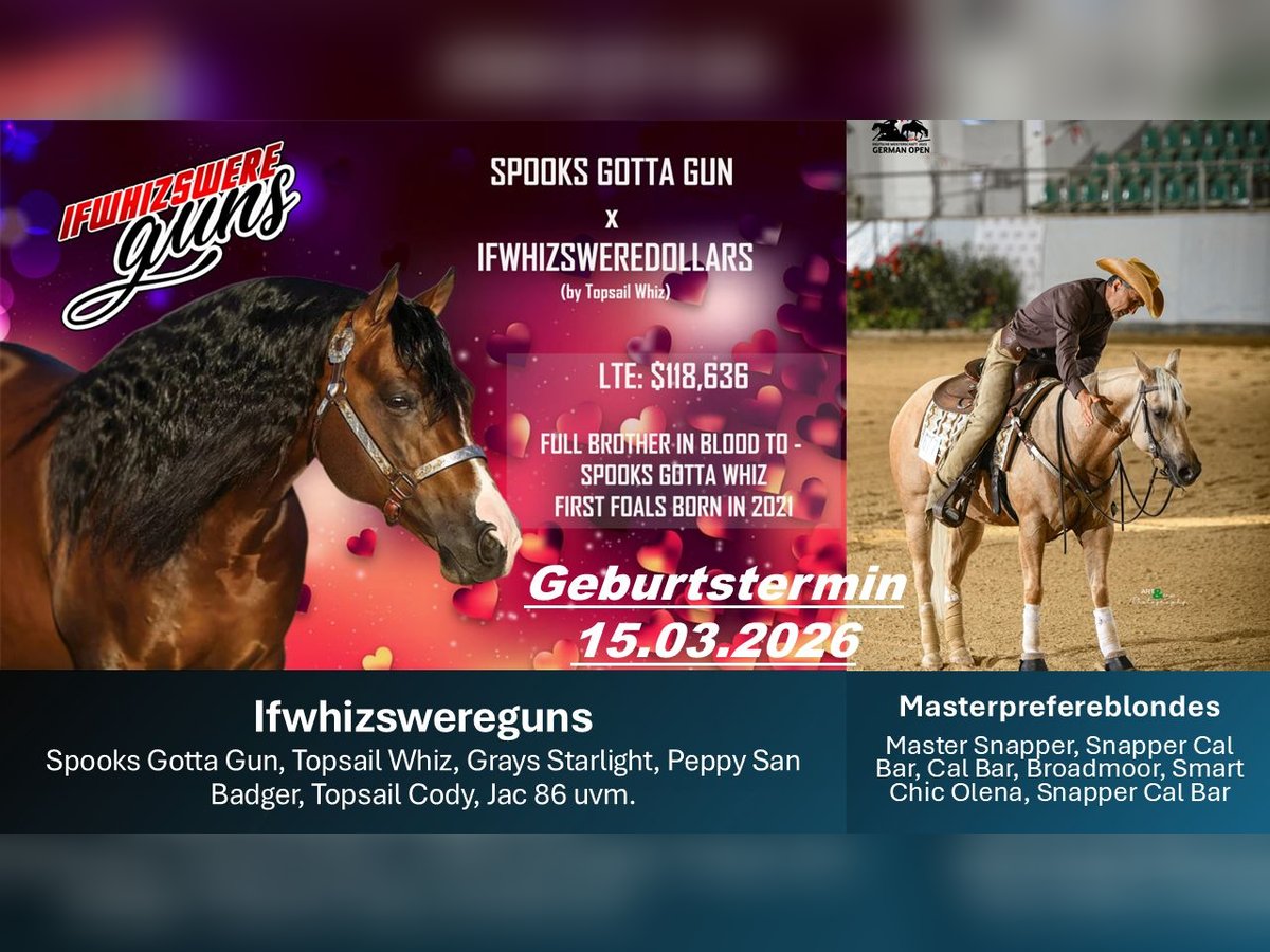 Außergewöhnliches Quarter Horse Hengstfohlen – Buckskin mit blauem Auge & Top-Reining-Abstammung Zum Verkauf steht ein absolut typvolles und korrekt gebautes Quarter Horse Fohlen in der begehrten Farbe Buckskin – ein echter Blickfang mit seinem seltenen blauen Auge. Dieses vielversprechende Nachwuchspferd überzeugt nicht nur optisch, sondern vor allem durch seine erstklassige Reining-Abstammung. In seinem Pedigree finden sich erfolgreiche und bewährte Linien, die für Talent, Athletik und Leistungsbereitschaft stehen – ideale Voraussetzungen für den Sport. Besonders hervorzuheben: in alle relevanten SSP-Programme einbezahlt registriert bei der American Quarter Horse Association (AQHA) zusätzlich registriert bei der American Paint Horse Association (APHA) Bereits jetzt zeigt das Fohlen: sehr gute Bewegungsqualität ein korrektes Fundament ein neugieriges, menschenbezogenes Wesen hohe Lernbereitschaft und Gelassenheit Es wächst artgerecht im Herdenverband auf und kennt den täglichen Umgang. Ob als zukünftiger Reining-Star, verlässlicher Freizeitpartner oder Zuchtperspektive – dieses Fohlen vereint Qualität, Charakter und besondere Optik. Bei ernsthaftem Interesse freuen wir uns über Ihre Nachricht. Gerne senden wir weitere Informationen, Bilder und Videos zu.