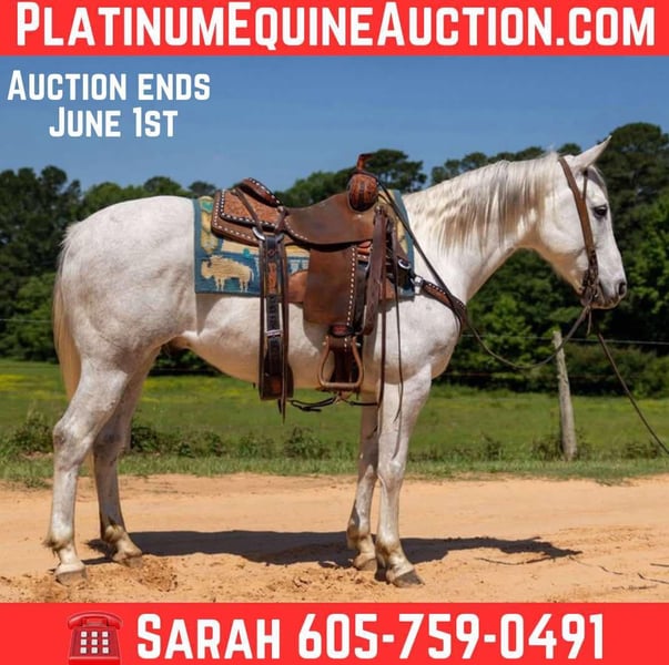 ONLINE AUCTION Place your bids at www.PlatinumEquineAuction.com Starting Bid $3500 Auction ends June 1st, 2025 Need a new saddle? Check out White Rock Saddles on our website or Facebook! Leo is a 9 year old gray gelding, he stands 14.2 hands tall. Leo has been mostly used as a trail horse, super easy to get along with, he has been ridden by all different ages. Leo is great outside and inside and has been trail rode all over! He crosses the water and goes wherever whenever with no hesitation. Leo has also been hauled to lots of playdays and fun shows and does super well at all the events. He has also been used on the ranch moving cattle and to gather and sort! Don’t miss out on this super nice little young gelding! He is located in Rusk TX, nationwide shipping is available. Call or text Bar S Livestock Sarah at 605-759-0491 for more info or to set up a time to come meet him! ONLINE AUCTION Place your bids at www.PlatinumEquineAuction.com Starting Bid $3500 Auction ends June 1st, 2025 Need a new saddle? Check out White Rock Saddles on our website or Facebook!