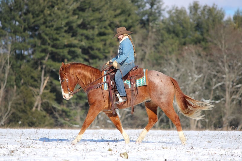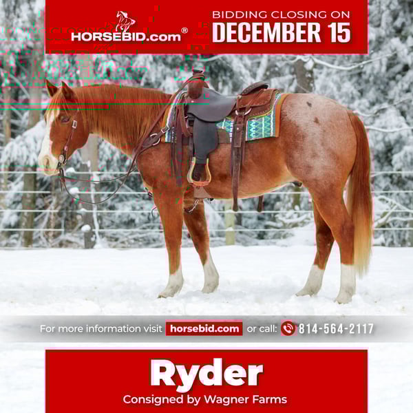 🎄𝐓𝐇𝐄 𝑯𝒐𝒍𝒊𝒅𝒂𝒚 𝐂𝐋𝐀𝐒𝐒𝐈𝐂🎄 Happening now thru MONDAY | DECEMBER 15th - Available EXCLUSIVELY on HorseBid's website! For more details and to register visit: www.Horsebid.com CONSIGNOR CONTACT: Wagner Farms 814-564-2117 LOCATION: Clarion, PA BREED: QH REGISTERED: No COLOR: Strawberry Roan HEIGHT: 14.3 AGE: 9 GENDER: Gelding Ryder is a 9 Year Old Strawberry Red Roan Quarter Horse Gelding. Standing 14.3 hands tall making him easy to mount and dismount but he is also stocky enough to carry any size rider. He stands very nicely at the mounting block to mount also. If your in the market for a really good broke but also super safe for any type of rider to ride and feel safe on then Ryder is the one your looking for. He is super quiet and gentle letting you feel relaxed and safe while riding him. He will help a timid rider gain there confidence. Ryder has worked on a large cattle operation and is capable of preforming any job on the ranch. He has roped and dragged calves to the branding fire and has pushed cattle in the pasture. I have primarily trail ridden him and he is a great trail horse. Rides anywhere you ask him to in the rough terrain and is very sure footed. He is a trail horse deluxe! He also rides nicely in the arena and has a nice walk , trot and canter and lopes nice circles. Watch him carry the American Flag and carry the big teddy bear! Nothing phases him. Ryder is a super nice all around good broke safe gelding! Dont miss out on him. Horses like him are super hard to find. Ryder had a Health and Lameness Exam on 12-1-25 and passed with flying colors. We can help arrange delivery anywhere in the United States. Call or Text Glory and Wagner Farms at 814-564-2117. Thank You and God Bless