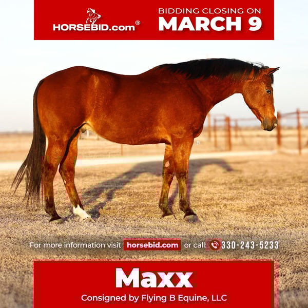 ℳ𝒶𝓇𝒸𝒽 ♦️𝐑𝐈𝐃𝐄𝐑'𝐒 𝐂𝐇𝐎𝐈𝐂𝐄♦️ Happening now thru MONDAY | MARCH 9th - Available EXCLUSIVELY on HorseBid's website! For more details and to register visit: www.Horsebid.com CONSIGNOR CONTACT: Flying B Equine, LLC 330-243-5233 LOCATION: Troy, TX BREED: AQHA REGISTERED: Yes REGISTERED NAME: MCM Maxxis The Great COLOR: Bay HEIGHT: 15 AGE: 10 GENDER: Gelding MCM Maxxis The Great affectionately known as “Maxx” is a 2016 Bay AQHA gelding that stands 15.0HH. If you’re looking for a well broke, personable, and soft gelding inside of the arena, look no further! Maxx has had 1 owner his entire life until us, and was leased out for several years for a little girl to be shown in 4H! Maxx would absolutely thrive in another 4H / show type home, or even relaxing with a casual weekend warrior! He is the ULTIMATE All Arounder! Halter, hunters, ranch riding, ranch trail, he WILL excel at it all! The arena is Maxx’s FAVORITE place to be! You can ride him western, english, or even bareback! He has had roughly 120’s Days of a professional tuneup between our barn and his previous owners. He is soft, polished and ready to go! He has been great for all levels of riders in the arena! He WTC with ease, transitions off of seat, leg and voice commands. He pivots 180’s or a 360’s, side passes, and backs up as well. He collects himself well and rides around cute and could easily stand out in the low level Hunters or ranch riding. He is really the perfect partner for a kiddo who needs the ultimate All-around show horse! He is soft in mouth and even rides around bridle-less great, and has a fantastic neck rein! His simple lead changes have been on point, and he is confident enough to step up and finish out into a flying change. This gelding is extremely willing and easy to teach anything to! We have taught him how to stretch out for mounting, as well as side passing to the mounting block, fence or object. Maxx absolutely loves to be ridden and you can ride him for hours every day, or once every two weeks and he will put his head in the bridle every time! Maxx has seen and done many things including carrying the flag, riding confidently through traffic, and over obstacles. We have also exposed him to cattle and roped and doctored a few yearlings off of him. He also started on the barrels as a 2-3 year old! He will truly do it all! Out on the trails, Max is sure footed and goes up and down all the terrain and over all of the logs and thick brush. Maxx will cross the ponds or the creeks! Maxx is the most confident out on the trail with another horse. When by himself, if he is unsure of a crossing he will stop and sometimes want to turn around or hesitate. We notice he doesn’t do this if he is following another horse, and think it is due to minimal exposure to rough terrain and minimal trail exposure prior to us purchasing him. We have worked on this, but believe if someone plans on trail riding long distances, by themselves, they will have to work with him through this. He is definitely a horse that is most confident when other horses are around. Maxx is great back at the barn! He stands great for the farrier, and is a great patient for the vet! He self loads, and follows you on the trailer, as well as backs off. He saddles up with ease, clips with no sedation needed, and loves a good bubble bath! He is great in mixed herds or turned out by himself. Maxx has spent his life in a herd and we do believe a home where he is the only horse is not best suited for him. He will load up on the trailer and haul alone or ride at the arena alone, but he may whinny a few times! Other than that, he is great in new environments and new arenas. Maxx is located with us in Troy, Texas and you are welcome to come see him in person. We can also help arrange shipping absolutely anywhere, as well as your own PPE if you’d like. A recent Pre-Sale Health and Soundness exam, more videos, photos and records are available to see and view on my website! Flyingbequine.com/maxx Please call Bailey with any questions, to schedule a PPE or viewing appointment, or to getting a shipping quote from our barn, to yours! (330) 243-5233