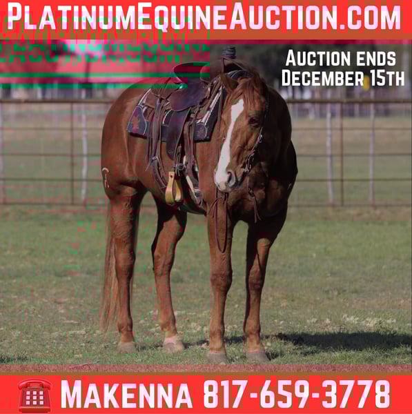 ONLINE AUCTION Place your bids at www.PlatinumEquineAuction.com Starting Bid $3500 Auction ends December 15th, 2024 Need a new saddle? Check out White Rock Saddles on our website or Facebook! Genuine Dry Azure… THE ULTIMATE ALL AROUND HORSE YOU’VE BEEN LOOKING FOR! Finished Head Horse Established Ranch Horse Weekend Warrior Barrel Horse Ranch Rodeo Horse Fun Trail Horse When someone talks about the word “BombProof”, this is the horse that comes to mind! We guarantee this horse safe for absolutely ANYONE who can hold the reins! Hermie is an 8 year old sorrel AQHA gelding that stands 15.3 hands tall. We’ve used him for just about everything and he never fails to give his all! From ranch rodeos to ropings, he stays level headed, takes as many runs as you ask if him. On the head side Hermie is solid as can be, has plenty of run and gives you the best shot every time, run 10 or 100 and he stays the same every run. Hermie was the main star at the last ranch rodeo, he had every cow roped on him, sorted every calf, and didn’t care about the wildness going on around him. Hermie is patterned on the barrels, just has never been seriously entered, he has the speed and athleticism to really go somewhere if someone seasoned him. Hermie is as broke as they come, he’s handy and will be a great addition to anyone’s string. We are located in Lipan Texas and have hauling available anywhere in the U.S., Hawaii or Canada! Don’t miss out on the gorgeous gelding! Please call or text Makenna Hartzel 817-659-3778. ONLINE AUCTION Place your bids at www.PlatinumEquineAuction.com Starting Bid $3500 Auction ends December 15th, 2024 Need a new saddle? Check out White Rock Saddles on our website or Facebook!