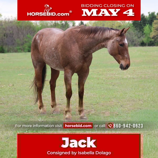 ▪️▫️◾️𝐭𝐡𝐞 𝑴𝒂𝒚 𝐒𝐞𝐥𝐞𝐜𝐭◾️▫️▪️ Happening now thru MONDAY | MAY 4th - Available EXCLUSIVELY on HorseBid's website! For more details and to register visit: www.Horsebid.com CONSIGNOR CONTACT: Isabella Dolago 860-942-0623 LOCATION: Ripley, OK BREED: QH REGISTERED: Yes REGISTERED NAME: KS DANDY DELUXE COLOR: Red roan HEIGHT: 15.1 AGE: 10 GENDER: Gelding Meet Jack the red roan gelding who’s got the looks, shape, ride, and personality to win you over! Jack is a 10 yr old gelding standing at 15.1 hands and weighing 1125lbs! He’s built phenomenally with a thick long neck, clean straight legs, big hip, and gorgeous red roan coat… the cherry on top! You’ll never have to stress about this horse either, he’s a very easy keeper who gets along with any horse and person and will meet you right at the gate! Jack loves his people he’ll be right there waiting for you every morning in the barn! If he was a person he would have the most polite manners! He minds his own business but also wants to be right there with you, he’s a respectful guy! Jack is one you can truly call kid broke!! Anyone in the family can saddle this gelding and lope him right out of his tracks with no worries! He rides around soft and correct, turns around and has a good stop! You can ride him in nearly any bit! He’s broke enough to head, heel, and play day off of! Jack has done it all from doctoring cattle on the wheat pasture, gathering cattle, loading trucks, elk hunting in the mountains, to play days and long days! He’s your right hand man you point where you want to go and no matter what he’ll get you there! He’ll walk through water, logs, ditches, brush, town, anything! He has no spook, buck, or rear. This horse is truly a gentle ranch horse deluxe!
