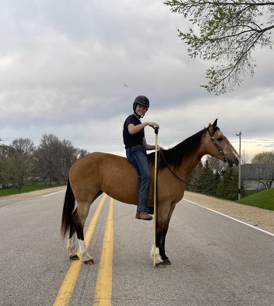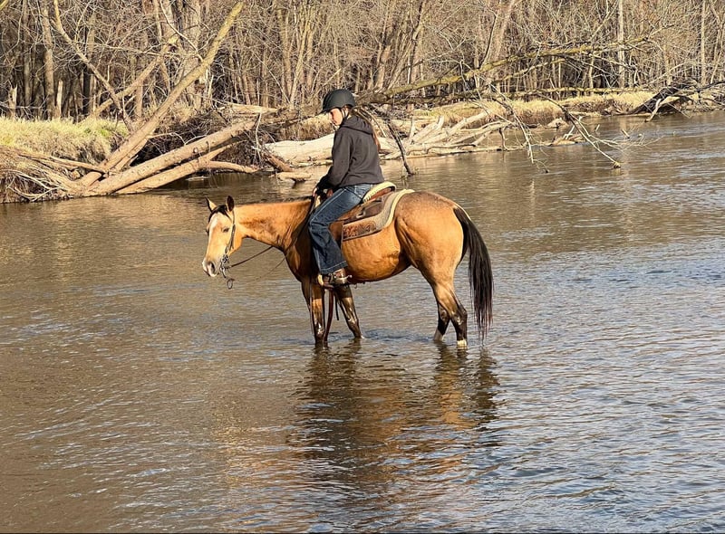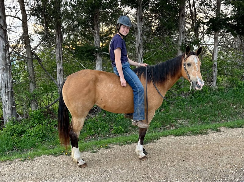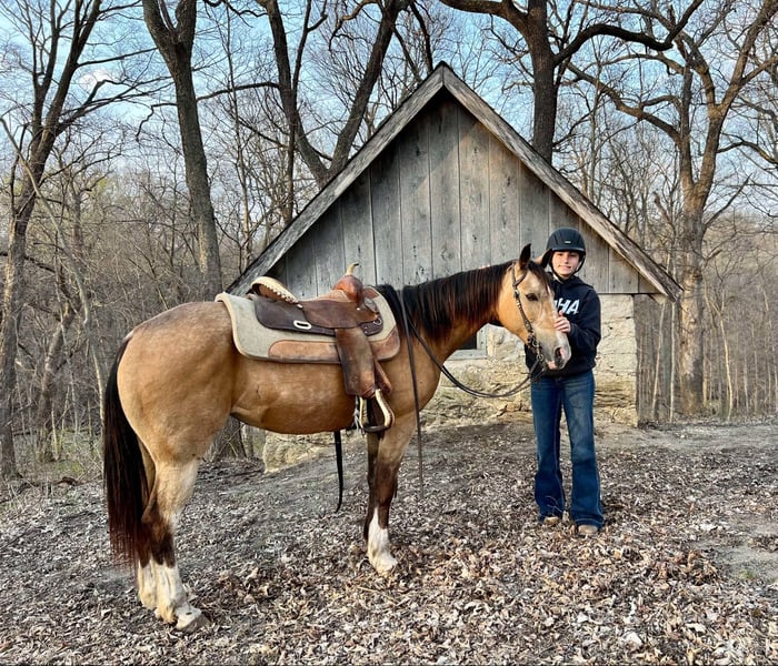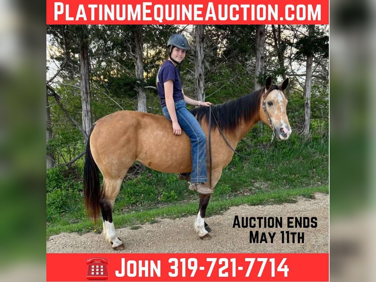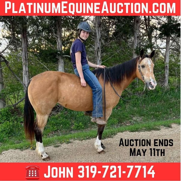ONLINE AUCTION Place your bids at www.PlatinumEquineAuction.com Starting Bid $3500 Auction ends May 11th, 2025 Need a new saddle? Check out White Rock Saddles on our website or Facebook! Juliet is a stunning 14-hand buckskin mare with three high white socks, a black mane and tail, and eye-catching dapples. Her size makes her ideal for children or smaller adults. At 10 years old, she has plenty of experience under saddle and a calm, willing demeanor that makes her stand out. She’s been ridden extensively on trails, including trips through the Black Hills and Palo Duro Canyon, as well as across rivers and along highways. For the past two years, Juliet has been a steady and reliable horse in a lesson program, working with intermediate riders. She excels on the trail and in parades, showing excellent surefootedness and confidence in a variety of situations. Juliet has impeccable ground manners, stands quietly for the farrier, and is easy to mount from a block or even a picnic table. She is not spooky and has no history of bucking, biting, or kicking. Juliet is as easy to care for as she is to ride. She loads into any type of trailer, does well in both stalls and pasture, and requires no special feed or maintenance. She is comfortable barefoot or shod and can be ridden English, Western, or bareback. No matter the discipline or setting, Juliet is a willing, dependable partner. Located in Lisbon, IA. Contact John McPhail 319-721-7714 with any questions. ONLINE AUCTION Place your bids at www.PlatinumEquineAuction.com Starting Bid $3500 Auction ends May 11th, 2025 Need a new saddle? Check out White Rock Saddles on our website or Facebook!