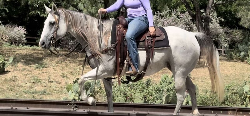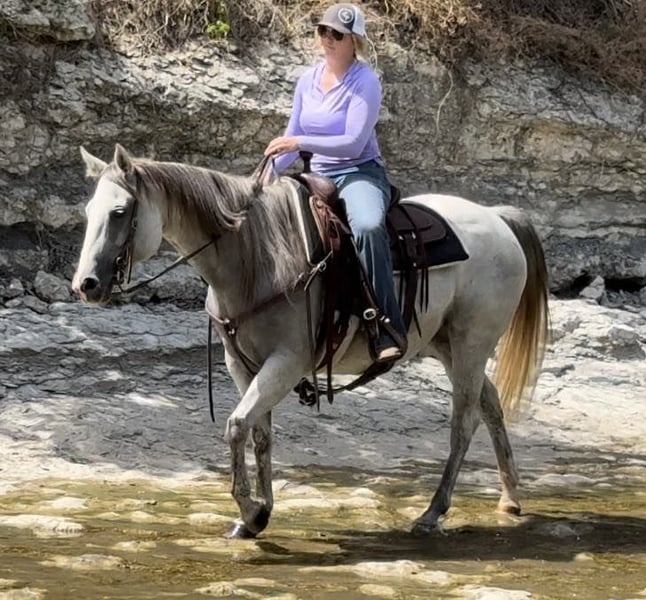 ONLINE AUCTION Place your bids at www.PlatinumEquineAuction.com Starting Bid $3500 Auction ends August 18th, 2024 Need a new saddle? Check out White Rock Saddles on our website or Facebook! Abby is a 9 yr old 14.2H, gorgeous, stout gray QH mare. She is a laid back trail rider’s dream! If you’re looking for one that’s more whoa than go, and extremely gentle natured, don’t miss this girl! Abby has been used as a family trail horse, where mainly the 11 yr old novice rider used her. She’s been rode in town and on trails primarily. She is not spooky in the slightest and is very laid back. She is one of those horses you can haul alone without her going crazy in the trailer or while tied looking for a friend. She stands solid footed wherever you tie her and bathes like a statue. Abby has a GORGEOUS long mane and tail with red highlights and she definitely gets you noticed wherever you take her! She would be the perfect first horse for the little girl who wanted to crawl all over/under her, braid her hair and call her sprinkles. She’ll stand all day without a fuss and is absolute safe safe safe on the ground to be around the littles. Abby is a brick house and she’ll be able to handle most any size rider! Under saddle, she is very much a more whoa than go kind of gal. While you can absolutely get her to switch gaits, she won’t be one that trots/runs off with you ever! She stands solid as a rock to mount and NEVER will take a step until asked. She goes through water, over railroads and by cars without an issues. In the car world, she’s your Honda Civic, trusty and reliable but not going to win the Daytona 500. Abby is absolutely gentle all the way around and if you can walk a friendly dog, you’ll absolutely be comfortable with this mare. She’s also a comfortable horse to ride at all gaits. She’s best at direct reining but definitely will neck rein with leg pressure. Abby always stops exactly when you ask her to no matter how fast you’re going. She has one of the best, most laid back, gelding like personalities we’ve ever seen with a mare. She gets along with all other horses well and is a zero drama mare. She would excel as a trail horse, lesson horse for baby beginners, first kid horse, or first horse for a timid rider/horseman. She’s an incredibly easy keeper and stays fat on air. Abby is UTD on teeth and feed and is ready to go be her new person’s giant, respectful, quiet, easy going, melodramatic partner! Go to her website page northtexashorsecompany.com/abby for more pictures and footage! Please call Blair with North Texas Horse Company for more info at 817-757-3046. We are located in Weatherford, TX and can help arrange affordable shipping to anyone!! ONLINE AUCTION Place your bids at www.PlatinumEquineAuction.com Starting Bid $3500 Auction ends August 18th, 2024 Need a new saddle? Check out White Rock Saddles on our website or Facebook!
