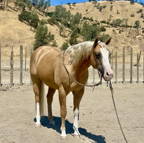 ONLINE AUCTION Place your bids at www.PlatinumEquineAuction.com Starting Bid $3500 Auction ends August 18th, 2024 Need a new saddle? Check out White Rock Saddles on our website or Facebook! Cruzn My Nu Hotrod is one of the coolest colored palomino geldings we have offered. He is dual registered with APHA and AQHA. He is a 2015 model, standing 14.3 hand. Hotrod has the look and shape everyone hopes to get. He is by The Great White Hope who goes back to NRHA 2 million dollar sire Nu Chex To Cash he also has the famous hall of fame stallion Zipps Chocolate Chip on his papers. Hotrod was started by a reining horse trainer and has all the fluently classy moves. He has been shown in ranch riding, ranch classes and trail. Hotrod has so much talent and a huge heart making him enjoyable for any discipline. Hotrod has a resume a mile long. He has classy spins, beautiful sliding stop and effortless circles. This boy has no holes or funny business making him the barn favorite to go out and do any job he is always gentle. Hotrod has superior ground manners making him a breeze to clip, brush, shoe, saddle and bath with zero conflict. Hotrod will cross any obstacle you throw at him with cadence and ease. He has done teetering bridges, crossed tires, will trot over poles and does the back through great. Hotrod has done all phases of ranch work and fun to brand, doctor, and sort cattle on he loves cow work. He is great out in the pastures gathering and will be sure footed, safe and will stay on any trail you choose he will walk over logs big rocks and ride through heavy brush. Hotrod has been started heeling and has what it takes to be a great rope horse. He hunts the corner, will get in position by himself, and has a great natural sliding stop. He has been hauled to state parks and has seen big trains, tourists, bicycle, hikers and joggers out on the busy trails and is completely unfazed by any of it. He has been ridden on the beaches and loves the water. Hotrod would be a great fit for a family trail horse, but is also broke enough to accomplish any task on the ranch. He hauls great hops in any trailer stands tied in cross ties, stands for mounting and dismounting. They don’t make them like this anymore! Hotrod is highly functional and still the definition of safe. This one of a kind gentlemen can take any amount of time off and still be gentle for the most novice riders. Hotrod has been exposed to busy streets cars, balls and flags and nothing bothers this exceptional gelding. Hotrod is athletic, good minded safe and a reliable ride. Hotrod is eager to please and always meets you at the gate to be caught. He is the go to for green riders and all around barn favorite. This wonderful boy has been a top notch ranch horse and family horse also fancy and classy enough for the show pen. We would be happy to show you this phenomenal gelding, give us call at Longhorn Ranch Dina 831-537-1915 Located in Paicines, CA. ONLINE AUCTION Place your bids at www.PlatinumEquineAuction.com Starting Bid $3500 Auction ends August 18th, 2024 Need a new saddle? Check out White Rock Saddles on our website or Facebook!