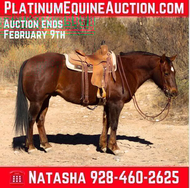 ONLINE AUCTION Place your bids at www.PlatinumEquineAuction.com Starting Bid $3500 Auction ends February 9th, 2025 Need a new saddle? Check out White Rock Saddles on our website or Facebook! Bear is a 10 year old grade gelding standing 15hh and stout as a tank!!! This magnificent gelding is the definition of gentle, well mannered, safe and kind!! Bear is absolutely in your pocket and loves attention! With a fancy handle and amazing attitude, this guy would suit absolutely anybody and go any direction! Whether you’re looking to lope flawless smooth circles around the arena, or hit the brushy trails, Bear is the gelding for you!! Bear will walk, trot, and lope both ways with ease, and has a fancy handle! Great neck rein and turn around, and stops on a dime! This big stout made gelding is an absolute gentleman in every possible way. Bear is easy to catch, groom, saddle, bridle, bathe, load, and shoe! Will come with a clean coggins and health!! Transport can easily be arranged anywhere in the US!!! Contact D/C Equine Services Dallas 804-822-2233 Natasha 928-460-2625 Located in Camp Verde, AZ. ONLINE AUCTION Place your bids at www.PlatinumEquineAuction.com Starting Bid $3500 Auction ends February 9th, 2025 Need a new saddle? Check out White Rock Saddles on our website or Facebook!