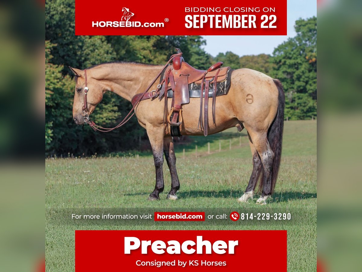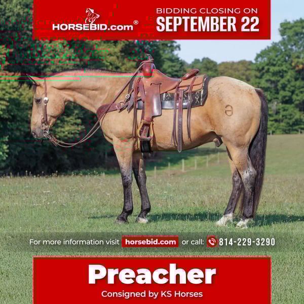 🍁𝒕𝒉𝒆 𝐅𝐀𝐋𝐋 𝑺𝒑𝒆𝒄𝒕𝒂𝒄𝒖𝒍𝒂𝒓🍁 Happening now thru MONDAY | SEPTEMBER 22nd - Available EXCLUSIVELY on HorseBid's website! For more details and to register visit: www.Horsebid.com CONSIGNOR CONTACT: KS Horses 814-229-3290 LOCATION: Clarion, Pa BREED: QH REGISTERED: No REGISTERED NAME: Preacher COLOR: Buckskin HEIGHT: 15.1 AGE: 10 GENDER: Gelding Preacher is a 10 Year Old Buckskin Quarter Horse Gelding. He comes off the Famous Padlock Ranch and wears there brand on his hip. Preacher is a Super Broke All Around Gelding . He can go in any direction. He is a Finished Ranch Horse, Trail Horse Deluxe and will ride around nicely in the arena . Preacher has a nice one hand neck rein, good stop and back up , side pass and smooth trot and lope. He is very broke and very seasoned and been there done that type of a horse. He is very sure footed in the rough terrain and the mountains. He has been rode countless miles on the ranch and the trail making his a safe ranch or trail horse. Trail ride him anywhere you want. He will trail ride in the front or back and will go where ever you point him and never refuse. GREAT TRAIL HORSE! He is 100 percent sound in every way. He has done every job on the ranch from roping and doctoring cattle to dragging calves to the branding fire to checking fences to letting the guest ride him up in the mountains on trails. Super Nice All Around Gelding. Whoever buys him is getting a awesome horse! We can help arrange delivery anywhere in the United States. Call or Text Kris at 814-229-3290. Thank You and God Bless