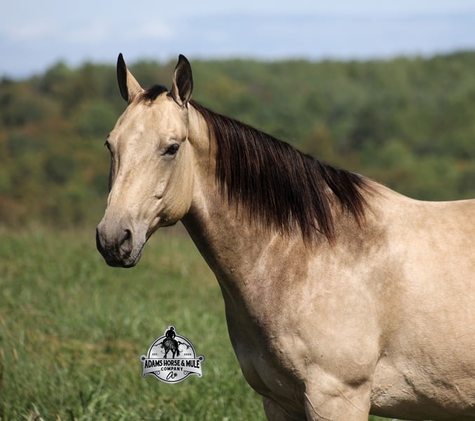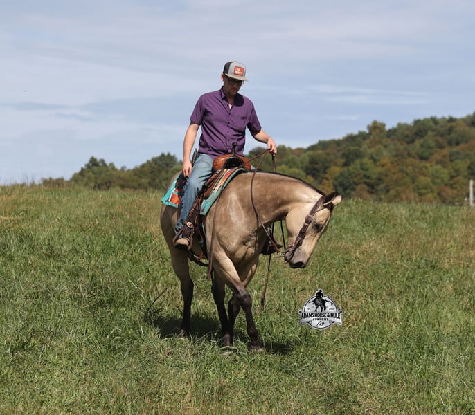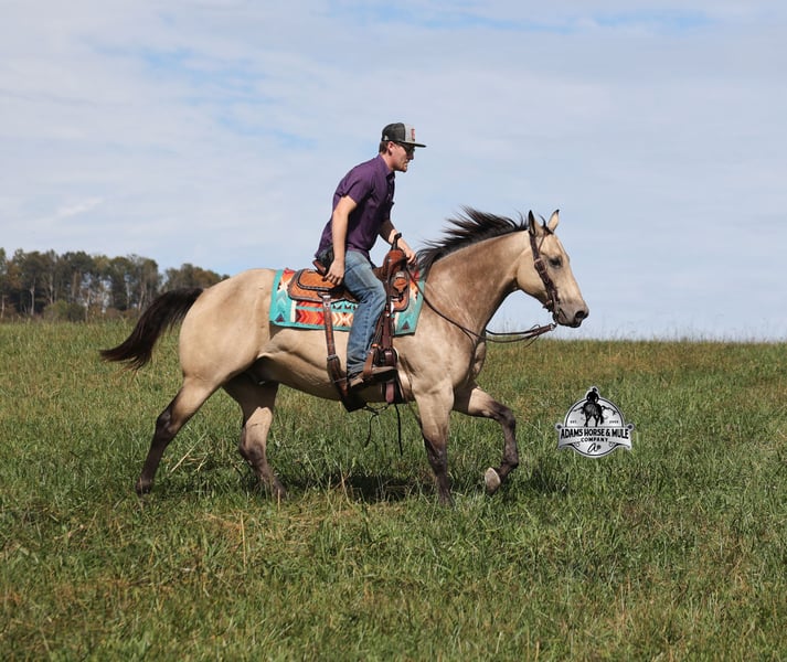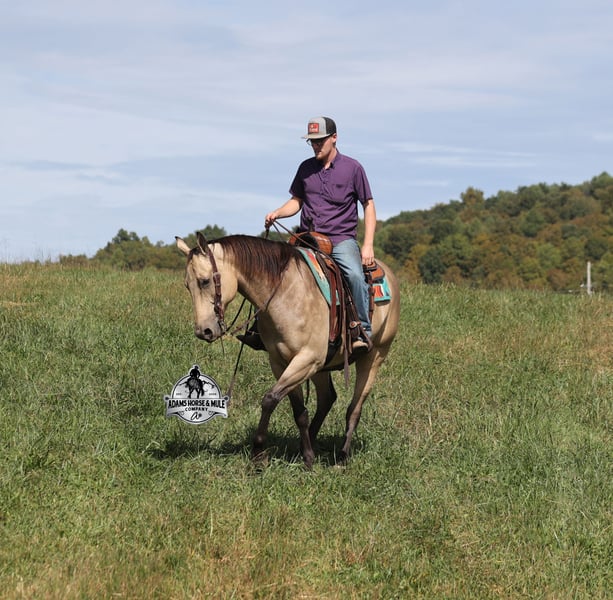 Go to visit our website for more pics and a video www.AdamsHorseAndMuleCo.com AHAMC has been in the horse business and sold horses over the internet since 2005. We have a long track record of success with hundreds of happy customers. We work hard to match riders with the correct horses and specialize in beginner safe, family friendly horses that have been used and checked out by our family! We can set up transportation anywhere in the US and look forward to working with you.Canyon is a beautiful buckskin gelding that is standing 15.2h+ tall. He is 10 years old and will weigh over 1300lbs. Canyon is super friendly and he loves attention! Canyon is a horse for all jobs, anything on the ranch from sorting to pasture roping, to trails up in the rugged mountains or back him in the box and collect a check… he will do it all and do it all- RIGHT! He will carry a nervous beginner, SAFLEY over all terrains on the trails, from steep slopes to rough rocky areas! Canyon has been ridden in multiple states from South Dakota to Wyoming down to Missouri and all around Kentucky. He has been used to pen cattle at the stockyards, he has worked at the feedlot sorting, loading trucks, roping and doctoring sick ones. Canyon has been hauled to jackpots and roped on the head side. He is a gentle, laid back type of horse that is gentle enough for all levels of riders and will build his riders confidence! You can leave him off for a couple months, tack him up, step right on him and he will walk off quietly and gentle. He has a smooth jog, takes his leads in a nice slow lope, spins around each way and has a good stop. He has been exposed to all kinds of wildlife and works well with stock dogs. He is 100% quiet to handle, no quirks, he is not cinchy or cold back. He is a true joy to own and is sure to be a loved addition to anyone’s family for years to come!