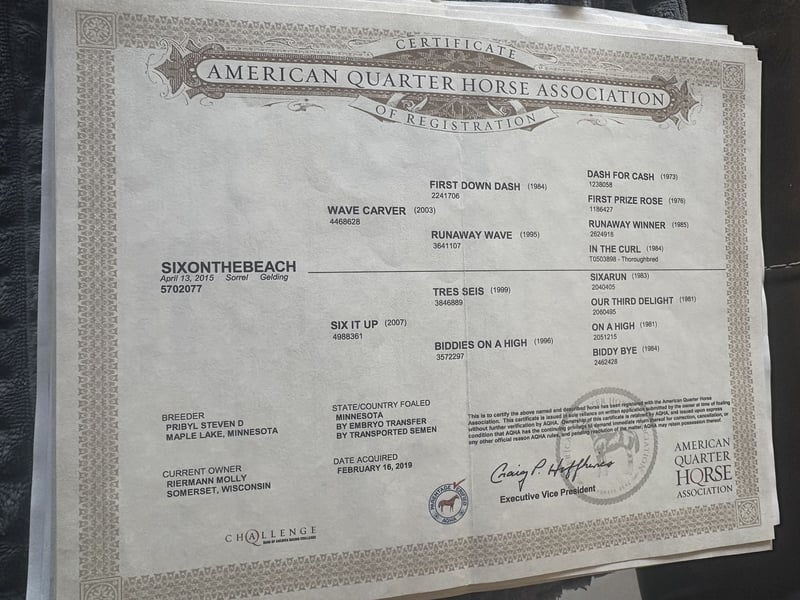 "VERFÜGBAR BEI DER ONLINE-PFERDEAUKTION UNTER www DOT MagicHorseAuction DOT com DIE AUKTION IST JETZT GEÖFFNET bis DIENSTAG | 16. SEPTEMBER! - SOFORTKAUF VERFÜGBAR! *Der endgültige Preis wird auf der Auktionsseite festgelegt* KONTAKTINFORMATIONEN DES EINLIEFERERS: 7FR Ranch - Molly Falconer 651-271-0237 STANDORT: Normangee, TX Lincoln ist bereit, den nächsten Schritt in seiner Leistungs-Karriere zu machen. Er wurde leicht zu Ausstellungen transportiert und ist bereit, weiterzumachen. Er ist ein mütterlicher Bruder des BBR-Weltmeisters und NFR-Qualifikanten, Sixappeal, geritten von Molly Otto. Wave Carver x Six It Up (x Tres Seis). Lincoln wurde als dreijähriger leicht geritten (SI 87) und es fehlt ihm nicht an Geschwindigkeit. Er hat einen großen, geschmeidigen Schritt und exceliert, wenn er eine Aufgabe hat. Er wurde mit Rindern konfrontiert, hat das Shagging gelernt und die Rinder vom Abtrennungssteg zurückgebracht. Er ist gezüchtet, um ein Leistungs-Pferd mit Geschwindigkeit zu sein und ist eher sensibel, weshalb er am besten für einen selbstbewussten, aber freundlichen Reiter geeignet ist. Wenn Sie weiterhin sein Vertrauen aufbauen und ihm Respekt zeigen, wird er hart für Sie arbeiten und Sie zum Gewinner machen. Lincoln verbrachte sechs Monate bei einem professionellen Barrel-Racing-Trainer, der ihn transportierte und ihm ein perfektes Muster beigebracht hat. Er ist korrekt gemustert und bereit, hinauszugehen und zu gewinnen. Lincoln ist ein außergewöhnlich gezogener Wallach mit bewährten Gewinnern auf der Rennbahn und im Barrel-Pen in seinem Pedigree. Er hat die Grundlage erhalten und ist bereit, weiterhin im Leistungsbereich voranzukommen. Verpassen Sie nicht die Gelegenheit, einen Wallach zu besitzen, der das Aussehen, das Talent und das Temperament hat, um Ihr nächster Champion zu werden. Lincoln ist bereit, seine Gewinnsträhne mit Ihnen fortzusetzen. Er badet, steht für den Hufschmied, transportiert gut und ist immer begeistert, Sie am Tor zu treffen. Lincoln hat ein großes Herz und ist bestrebt, zu gefallen. Laden Sie ihn auf den Anhänger und haben Sie Spaß. Bitte kontaktieren Sie Molly Falconer für weitere Fragen. (651)-271-0237"