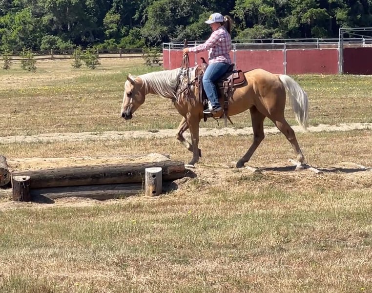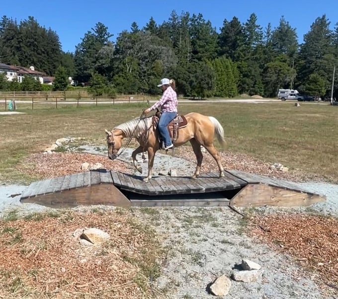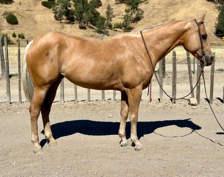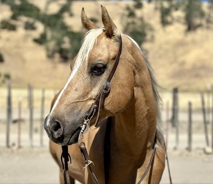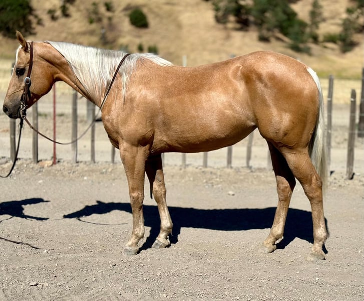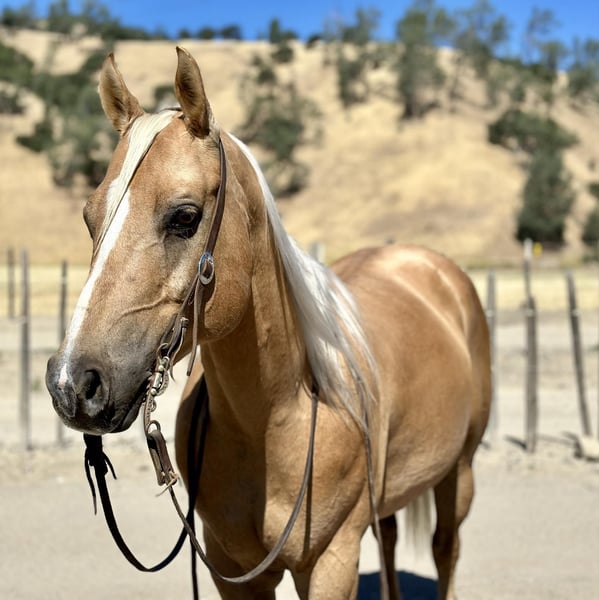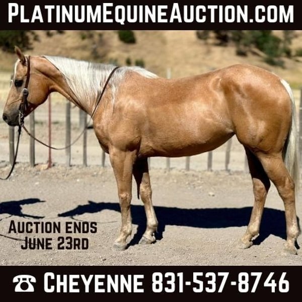 ONLINE AUCTION Place your bids at www.PlatinumEquineAuction.com Starting Bid $3500 Auction ends June 23rd, 2024 Need a new saddle? Check out White Rock Saddles on our website or Facebook! Barbie Doll is a 10yr old grade palomino mare, standing 14.3HH. And yes, she is the Barbie dream horse of every little girls dreams! Barbie had a gentle, kind demeanor and everyone loves her! She is calm, and very easy going to be around. With impeccable ground manners she makes it manageable for any level rider to tack up for a great days ride. Under saddle, Barbie is laid back, slow and easily navigated by one soft touch of a rein. Barbie is responsive to leg cues and rein cues. Barbie has no need for a bridle, you can get her to do whatever you want with just a string around her neck! She is smooth and has nice transitions in between her gaits. She is one of our all time horse to take out on a trail ride with how uncomplicated she is. She makes any ride worry free and fun! She has been used on all trail obstacles and will do anything asked of her! She has been to mountain trails, down busy highways, and hauled around to local shows. Barbie is not afraid of anything and has zero spook. She has carried flags and walked over tarps without a blink of an eye. She is not “marish” at all and gets along with everyone. She has zero issues.. stands tied quietly, very easy to shoe, loads and hauls great, and requires no maintenance. Located in Bitterwater, CA. For more info contact Cheyenne Rey 831-537-8746. ONLINE AUCTION Place your bids at www.PlatinumEquineAuction.com Starting Bid $3500 Auction ends June 23rd, 2024 Need a new saddle? Check out White Rock Saddles on our website or Facebook!