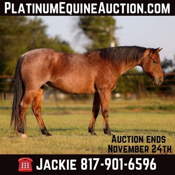ONLINE AUCTION Place your bids at www.PlatinumEquineAuction.com Starting Bid $3500 Auction ends November 24th, 2024 Need a new saddle? Check out White Rock Saddles on our website or Facebook! Chicks Speedy Doc, Aka Stanley is a 14.3 hand tall 10 yr old gelding registered in AQHA. Talk about flashy, he is a beautiful bay roan with long mane and tail. He definitely gets noticed everywhere he goes. He comes from a strong line of great horses in his pedigree. Stanley has been used on our ranch for several years and will go anywhere you point him with ease. He has great feet and will go in any kind of terrain. He is very sure footed. He will go down the trails, over logs, up steep terrain, through the river water, jump up on big rocks, he does not ever resist what you ask him to do. He has also been used in parades, carried flags, used for hunting trips, roped big cows in pasture, runs barrels, you name it he’s done it. If you’re looking for a very versatile horse that is gentle and sound for the whole family, Stanley is definitely one you will want in your barn. Feel free to call or message Circle H Ranch Jackie 817-901-6596 to schedule a time to come try him in Weatherford, TX. Shipping can be arranged anywhere in the US. ONLINE AUCTION Place your bids at www.PlatinumEquineAuction.com Starting Bid $3500 Auction ends November 24th, 2024 Need a new saddle? Check out White Rock Saddles on our website or Facebook!