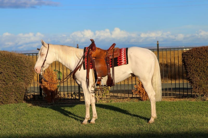 ONLINE AUCTION Place your bids at www.PlatinumEquineAuction.com Starting Bid $3500 Auction ends November 3rd, 2024 Need a new saddle? Check out White Rock Saddles on our website or Facebook! Meet Blizzard a 10 year old, 15h, Cremello, grade Quarter Horse gelding. He is the most beautiful and sweetest horse you could ever dream of owning! With his been-there, done-that attitude, Blizzard is a steady and reliable companion for all your riding adventures. Whether you’re cruising down trails or working in the arena, or cruising the city streets, he makes everything feel effortless. Blizzard is an experienced trail horse who can handle anything you throw at him. He’s crossed creeks, bridges, rocky terrain, and muddy paths with ease. His sure-footedness ensures he never rushes, taking his time to carefully navigate steep hills, making him the easiest ride on any trail. Blizzard has encountered all sorts of obstacles – from pool noodles to tarps, swaying bridges, and streamers, livestock, wildlife, bikes, strollers, guns, smoke, heavy equipment– and hasn’t blinked an eye. He’s even had guns shot off of him, remaining calm and steady the whole time. If you’re looking for a horse who can do it all, Blizzard is your guy. In the arena, Blizzard is extremely well-broke and responsive. He knows his leads, has a fantastic stop, backs up, side passes, and neck reins with ease. His gaits are incredibly smooth, so much so that you could canter on him all day, feeling like you’re floating on a cloud. One of his most impressive qualities is his ability to ride just as well bridleless as he does with a bridle. His training and natural temperament make him the type of horse you can let sit for weeks, and he’ll ride off like you worked him yesterday. Blizzard has been ridden in all kinds of weather, including rain and high winds, and handled it all like a champ – no bridle, no problem. He’s one of the rare few horses I can fully trust in any condition. Blizzard is also a dream to have around the ranch, making him the perfect family horse. He stands patiently for saddling, grooming, baths, and the farrier, and he loads and unloads easily, never rushing in or out of the trailer. Blizzard is hands down the easiest horse we have ever owned. Don’t miss out on this incredible gelding – he’s ready to be your next all-around family horse or ranch partner! Reach out for more information or to schedule a visit to meet Blizzard. Please contact Kamryn at KW Ranch 530-852-2032 Located in Pleasant Grove, CA. ONLINE AUCTION Place your bids at www.PlatinumEquineAuction.com Starting Bid $3500 Auction ends November 3rd, 2024 Need a new saddle? Check out White Rock Saddles on our website or Facebook!