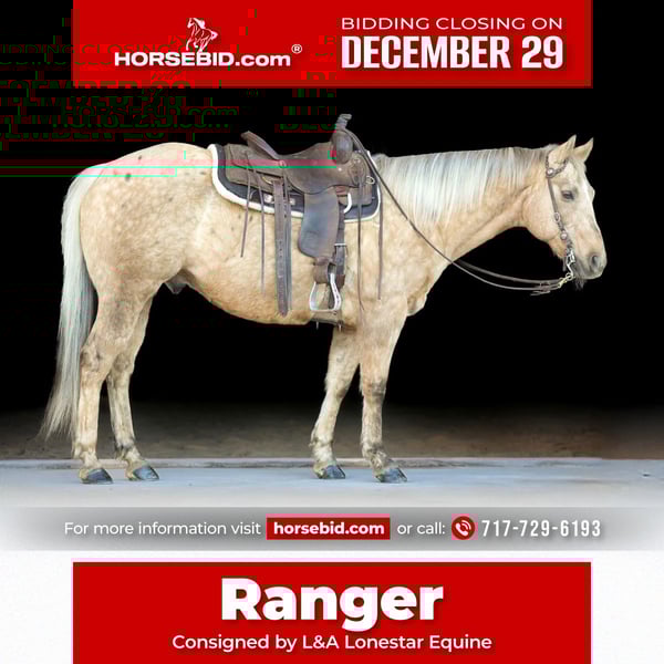 ⚜️ 𝓗𝓮𝓻𝓲𝓽𝓪𝓰𝓮 𝐖𝐢𝐧𝐭𝐞𝐫 𝓒𝓵𝓪𝓼𝓼𝓲𝓬⚜️ Happening now thru MONDAY | DECEMBER 29th - Available EXCLUSIVELY on HorseBid's website! For more details and to register visit: www.Horsebid.com CONSIGNOR CONTACT: L&A Lonestar Equine 717-729-6193 LOCATION: Needmore, PA BREED: Quarter Horse REGISTERED: No REGISTERED NAME: Ranger COLOR: Palomino HEIGHT: 15 AGE: 11 GENDER: Gelding Ranger is a 11-year-old, 15 hh palomino with a unique golden color and the kind of quiet, dependable temperament that makes a truly good ranch horse. He is a solid, well-broke ranch and arena horse that neck reins, goes easily into the walk, trot, and lope, and consistently picks up both leads. Ranger has a great stop, is excellent at backing, and rides balanced and responsive. He is comfortable working in the arena and carries himself correctly with a smooth, easy feel. Outside the arena, Ranger is confident and sensible, handling cars and new environments without issue. He is the kind of horse you can saddle up and go to work on without drama. On the ground, Ranger is easy and straightforward. He is easy to catch and stands quietly for saddling, mounting, and grooming. He has a kind, willing attitude and no bad habits. Ranger is the type of good-minded ranch horse everyone looks for, and with his temperament and standout palomino color, he is hard to find and easy to appreciate.