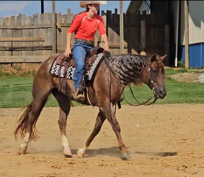 ONLINE AUCTION Place your bids at www.PlatinumEquineAuction.com Starting Bid $3500 Auction ends September 15th, 2024 Need a new saddle? Check out White Rock Saddles on our website or Facebook! DDD Busy Blazin Batt is a 10 year old AQHA RED ROAN Gelding. He stands 15 hh and around 1100lbs. Here is one of the coolest looking geldings with a long beautiful thick main & tail. Bart has been extensively trail ridden/overnight camped & worked in the stocked yards for the last 6 years. He is a very confident trail horse that has seen it all out on the trails. This gelding will cross water, logs, ditches, etc without hesitation. Has a great one hand neckrein, gives to the bit laterally and vertically. He will ride in a soft snaffle with ease. Bart hasn’t had a lot of arena time in his life, but has spent the last 4 months with us. Where we put him through our desensitizing & shown horse program. We have even rode him english & he looks beautiful doing it! This gelding walks, trots, canters collected, side passes, and is started on turn arounds. He works off your seat and leg well. He is a forward moving, forward thinking horse that is going to look SHARP in the ranch arena. This gelding has a natural low and flashy headset. Bart has a to die for extended trot! This gelding isn’t going to be your deadhead babysitter, but if you’re looking for a trail horse that has already seen the sights and is ready to go on with in the arena, here he is! You won’t find another one like him! He stands all day tied, is great for baths, loads, unloads, hauls in anything, and is great for the farrier. Bart is currently barefoot and has excellent feet. Make an appointment today to meet Bart. Shipping is availability anywhere in the US. Located in Robards, KY. Please call/text Jarrod Singleton 434-981-3863 for more information. ONLINE AUCTION Place your bids at www.PlatinumEquineAuction.com Starting Bid $3500 Auction ends September 15th, 2024 Need a new saddle? Check out White Rock Saddles on our website or Facebook!