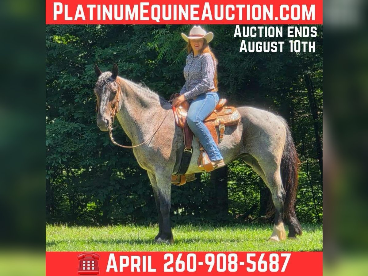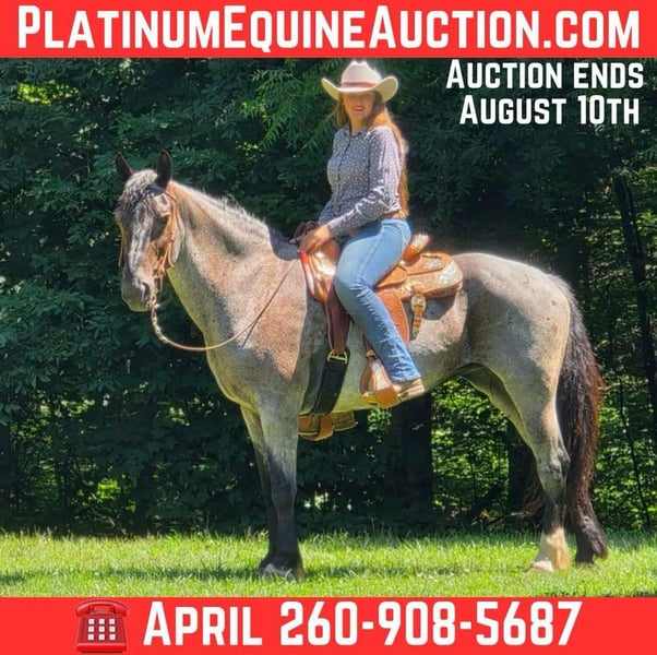 ONLINE AUCTION Place your bids at www.PlatinumEquineAuction.com Starting Bid $3500 Auction ends August 10th, 2025 Need a new saddle? Check out White Rock Saddles on our website or Facebook Cruella is a stunning 11 year old Blue roan Friesian-Quarter Horse cross mare. Standing 15.3 hands tall. And is absolutely gorgeous! She has all the right moves for anyone wanting to trail ride and or put her in the show pen. She loves arena work and never sours. Cruella has a lot of trail miles and has predominantly been ridden by a fifteen year old girl. She has done her time with traveling all over for overnight camping trips and trail rides. Cruella will stand great at the trailer and or a picket line. She will ride out alone or with a big group of people. She loves to lead everybody on the trail. But she will gladly follow too! Cruella will go up the steepest hills and down the steepest terrain. She will cross logs and goes through water without hesitation. She has been ridden through town and never misses a beat. She is great in a pasture with other horses. She stands great for the ferrier and to be bathed. Cruella has a great slow collected trot, and will also extend her trot when needed. Her lope is amazing and an absolute joy to ride out! She has been ridden western, english, bareback and double. She will also jump! She is ball broke and tarp broke. She is desensitized to the fullest! Cruella is easy to catch in the field and always meets you at the stall gate for attention! You have to come check this lady out! Please contact for more information. We can also arrange shipping to make sure she arrives safely! Located in Camden, MI. For more info contact April with Mid-West Performance Horses 260-908-5687. ONLINE AUCTION Place your bids at www.PlatinumEquineAuction.com Starting Bid $3500 Auction ends August 10th, 2025 Need a new saddle? Check out White Rock Saddles on our website or Facebook