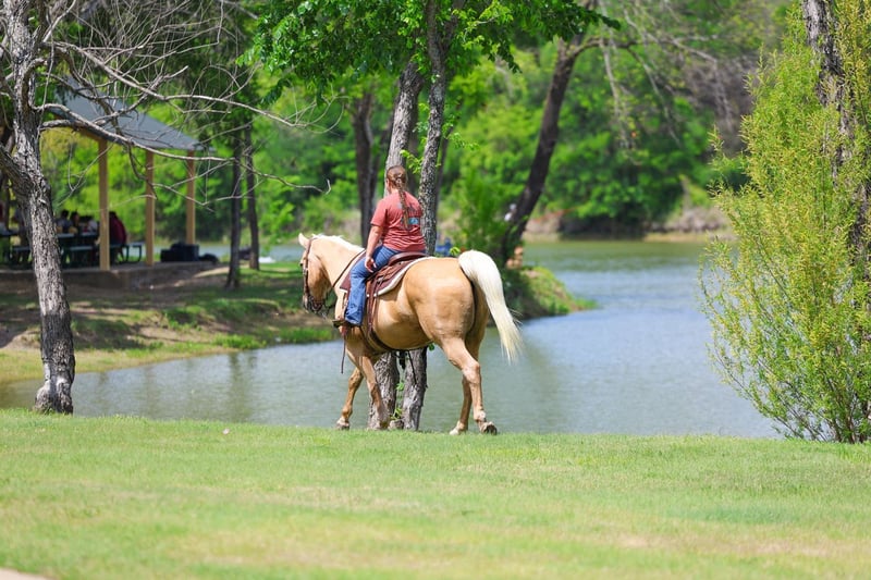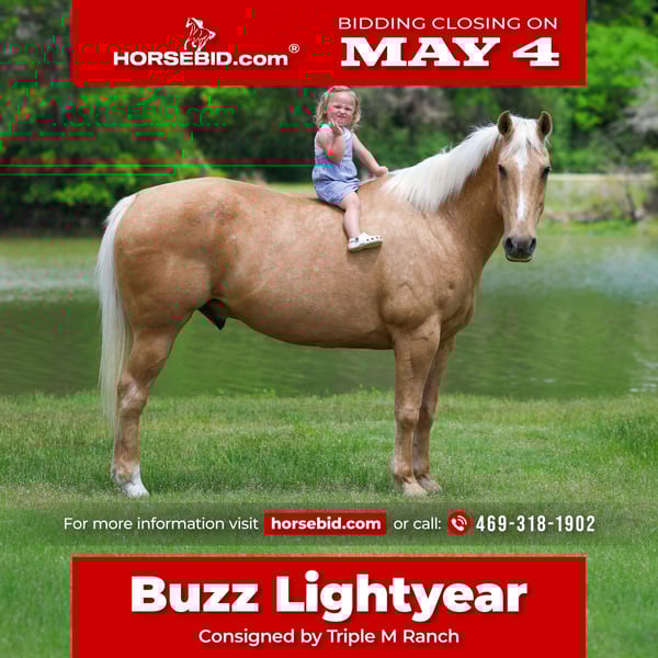 ▪️▫️◾️𝐭𝐡𝐞 𝑴𝒂𝒚 𝐒𝐞𝐥𝐞𝐜𝐭◾️▫️▪️ Happening now thru MONDAY | MAY 4th - Available EXCLUSIVELY on HorseBid's website! For more details and to register visit: www.Horsebid.com CONSIGNOR CONTACT: Triple M Ranch 469-318-1902 LOCATION: Forney, TX BREED: Quarter Horse REGISTERED: No REGISTERED NAME: Buzz Lightyear COLOR: Palomino HEIGHT: 14 AGE: 13 GENDER: Gelding Let me introduce you to Buzz Lightyear. A super cute old fashioned made golden palomino gelding. He is one of those BOMBPROOF UNICORN type gelding! Buzz is the perfect little fun size horse standing 14 hands tall. He has been part of our family for along time now and has taught so many kids how to ride. Buzz is just 13 years (vet confirmed the age) so still has a lifetime to be rode and enjoyed. He has manners and rides around like a solid ranch horse should, he's as broke as broke gets and I would trust him with any kid, small adult, grandma or grandpa, any age, beginner, timid rider, etc.. Doesn't matter. You can ride him and he will take care of you. I trust anyone can ride him anywhere. Absolutely NO kick or buck in him! Absolutely no bad habits! Absolutely no maintenance. He is simple, easy, and fun to ride. He has been more miles and seen more country than most people! When I say he's been there and done that I mean it, he knows what a hard days work is outside in the country and will last all day. He is one handed broke, neck reins, and has a good stop! He has always been willing to go or do anything they have asked. He will ease thru the creeks/ponds, thickets, traffic safe, train safe, machinery safe, loud noises don't bother him. He's been to ropings, barrel races, rodeos, spent many long days working cows, dragging calves, hog hunting, swimming ponds, tied out camping, and been thru every aspect of the woods from thickets to boggy creeks, and trail riding down the roads. Trains honking and going by don't bother him, he will ride right next to it. We carry multiple buckets of feed strapped over his back to help carry to feed. Buzz Lightyear has also been used to carry the American flag for the National Anthem at rodeos. He is BOMBPROOF, absolutely no spook at all and will go anywhere he is pointed, he never refuses or says no. He is a once in a lifetime time little horse. He is one of those that is as honest as the day is long. He's easy to catch, bathe, and hauls like a champ. He has the biggest heart. I trust this little horse enough for little kids to run up to him from the front or back and he will stand like a rock. You can go rope on him, pop bull whips, run barrels, run poles, goats tie, TRICK RIDE, breakaway, and trail ride! Buzz will walk, trot, lope, or go as fast as you want. He is the coolest horse around. He leads, loads, ties, bathes, clips, and stands for the farrier. Very easy keeper. Requires nothing special. We keep him barefoot but you can shoe him if you want. Please don't hesitate to call us about, we love to talk to you about him. He is 100% safe and sound in every way. We had our vet do a pre evaluation on him included in the pics. We can help with making shipping arrangements to anywhere needed. Buzz is ready for his new home.